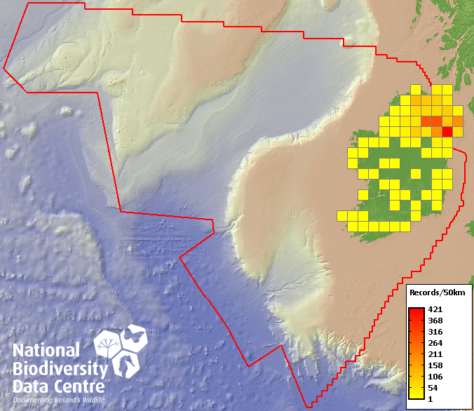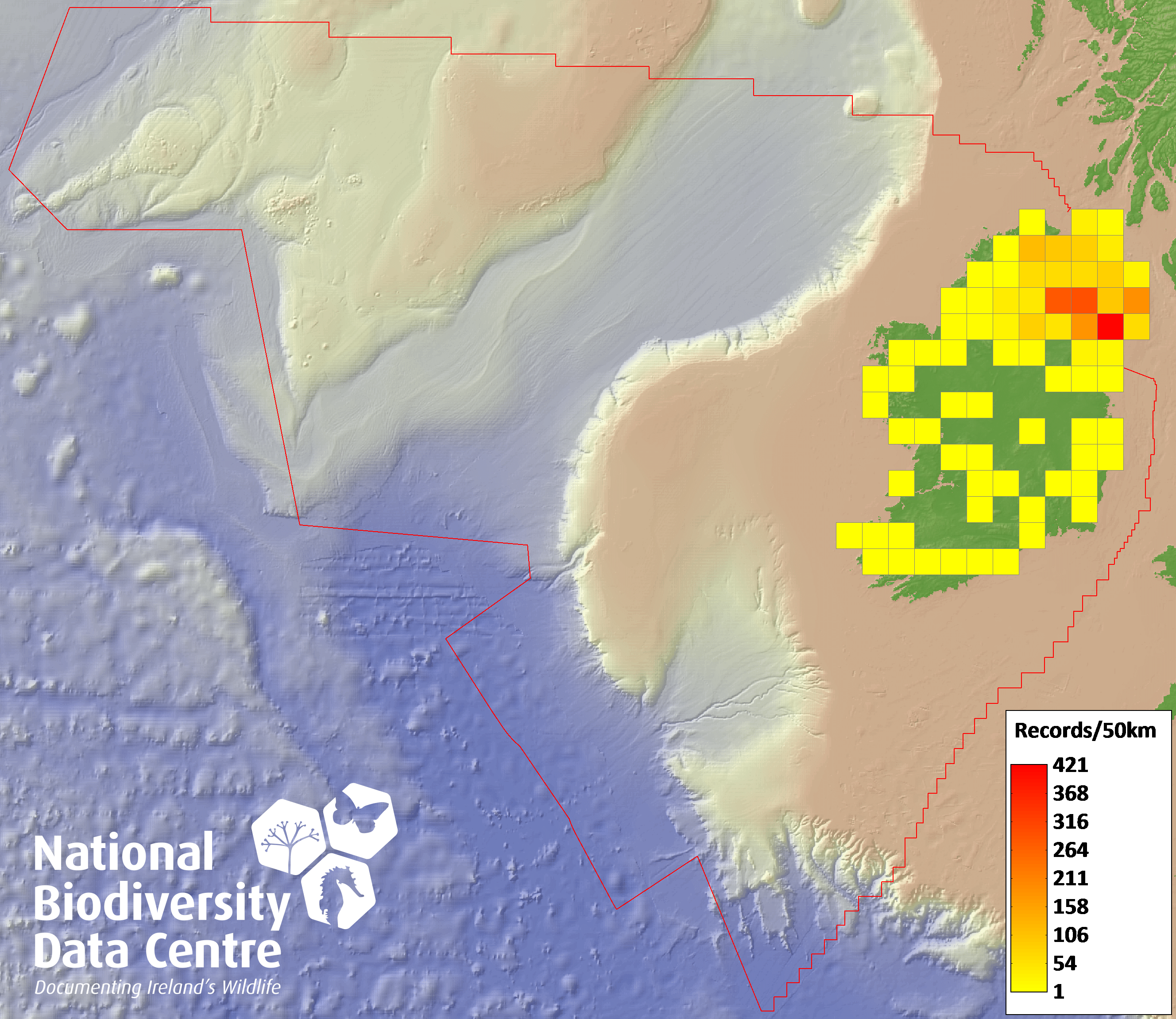Distribution of the number of records recorded within each 10km grid square (ITM).Marine Map - 50km