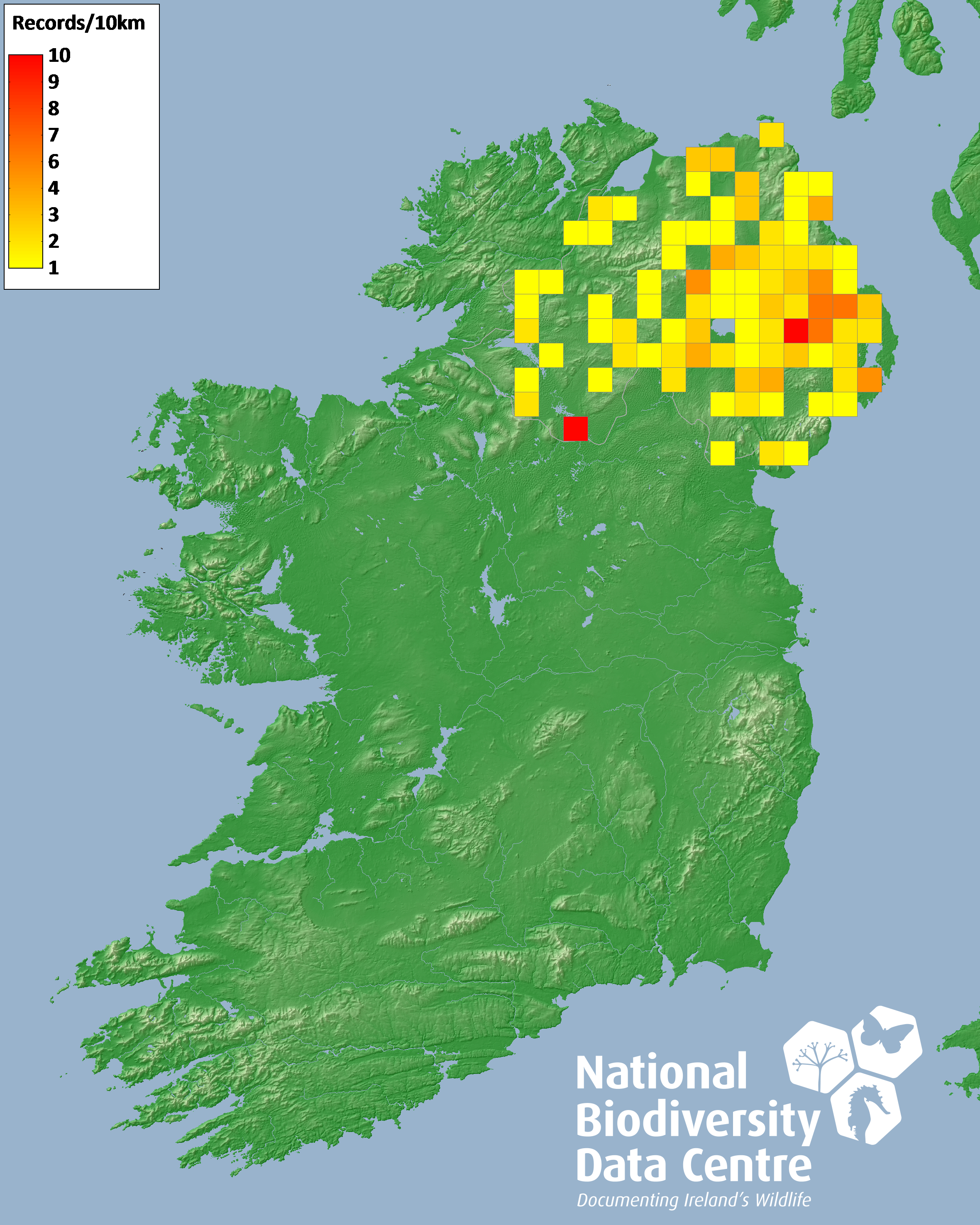 Distribution of the number of records recorded within each 10km grid square (ITM).Marine Map - 50km