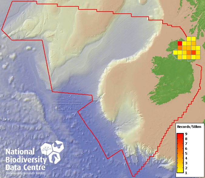 Distribution of the number of records recorded within each 10km grid square (ITM).Marine Map - 50km