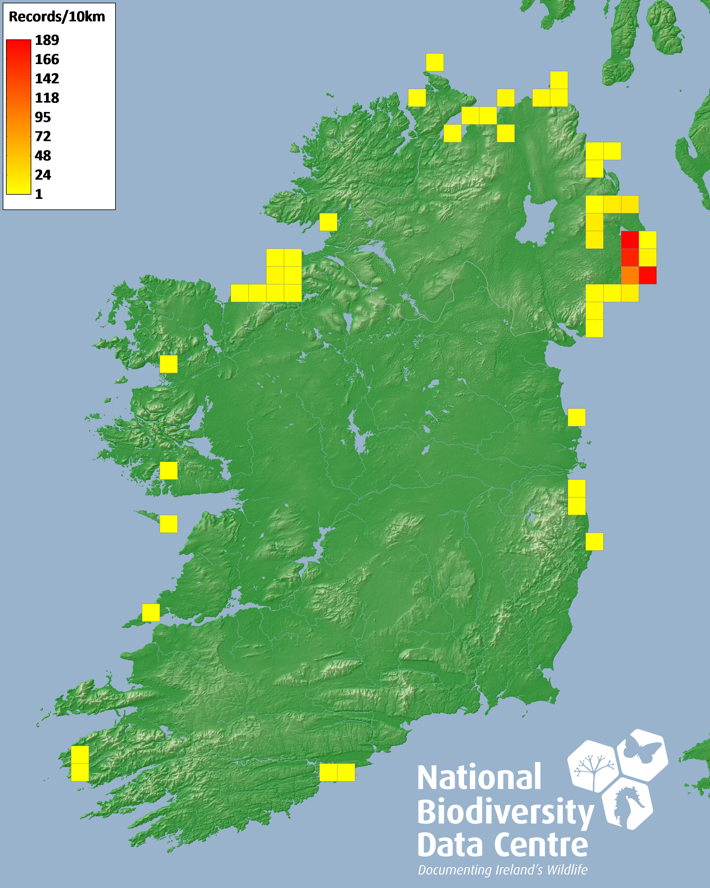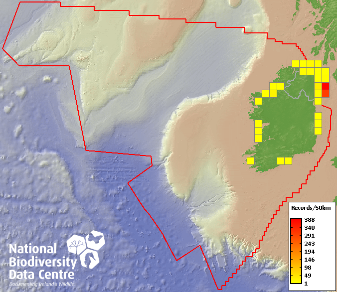 Distribution of the number of records recorded within each 10km grid square (ITM).Marine Map - 50km