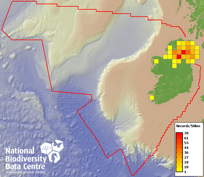 Distribution of the number of records recorded within each 10km grid square (ITM).Marine Map - 50km