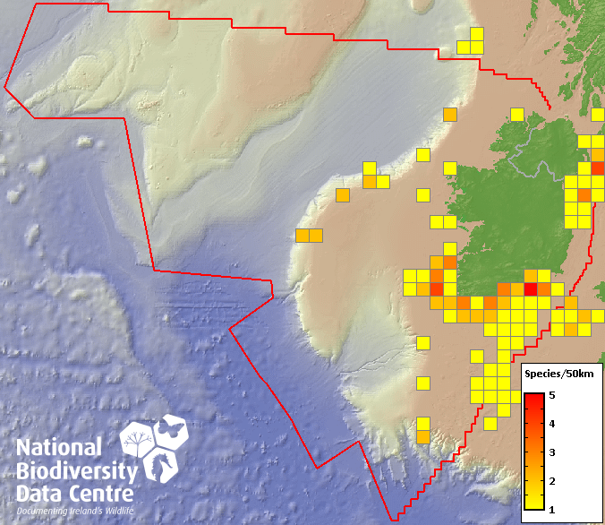 Distribution of the number of species recorded within each 10km grid square (ITM).Marine Map - 50Km