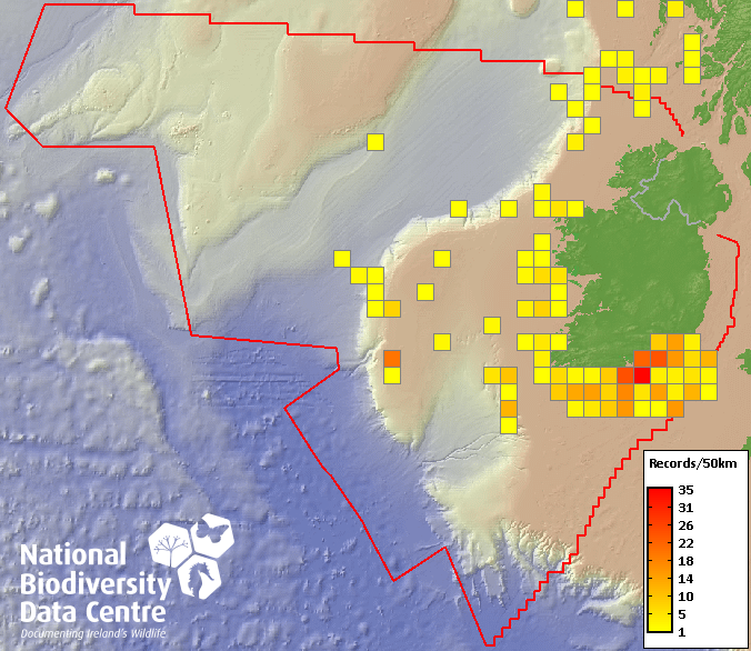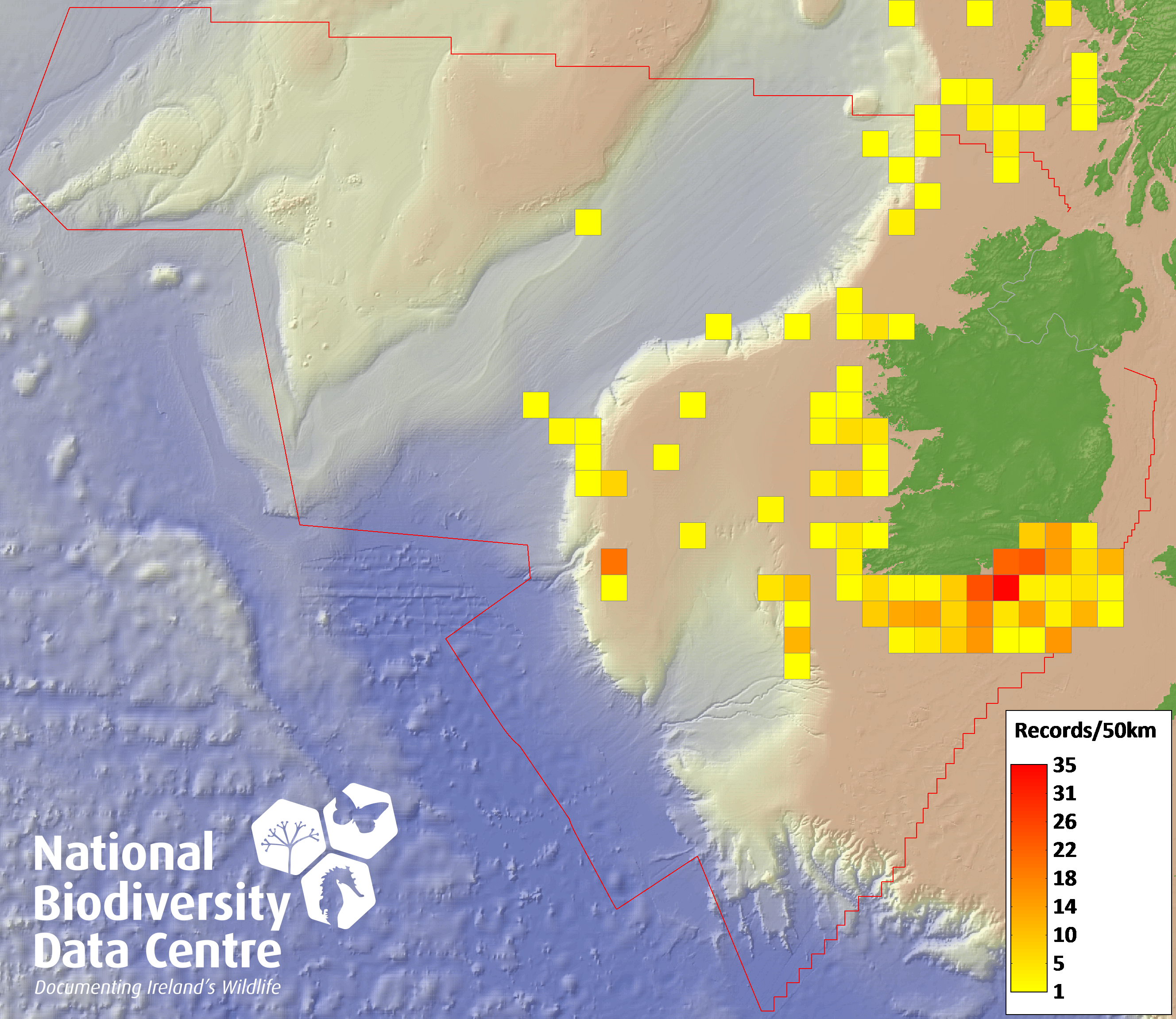 Distribution of the number of records recorded within each 10km grid square (ITM).Marine Map - 50km