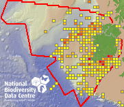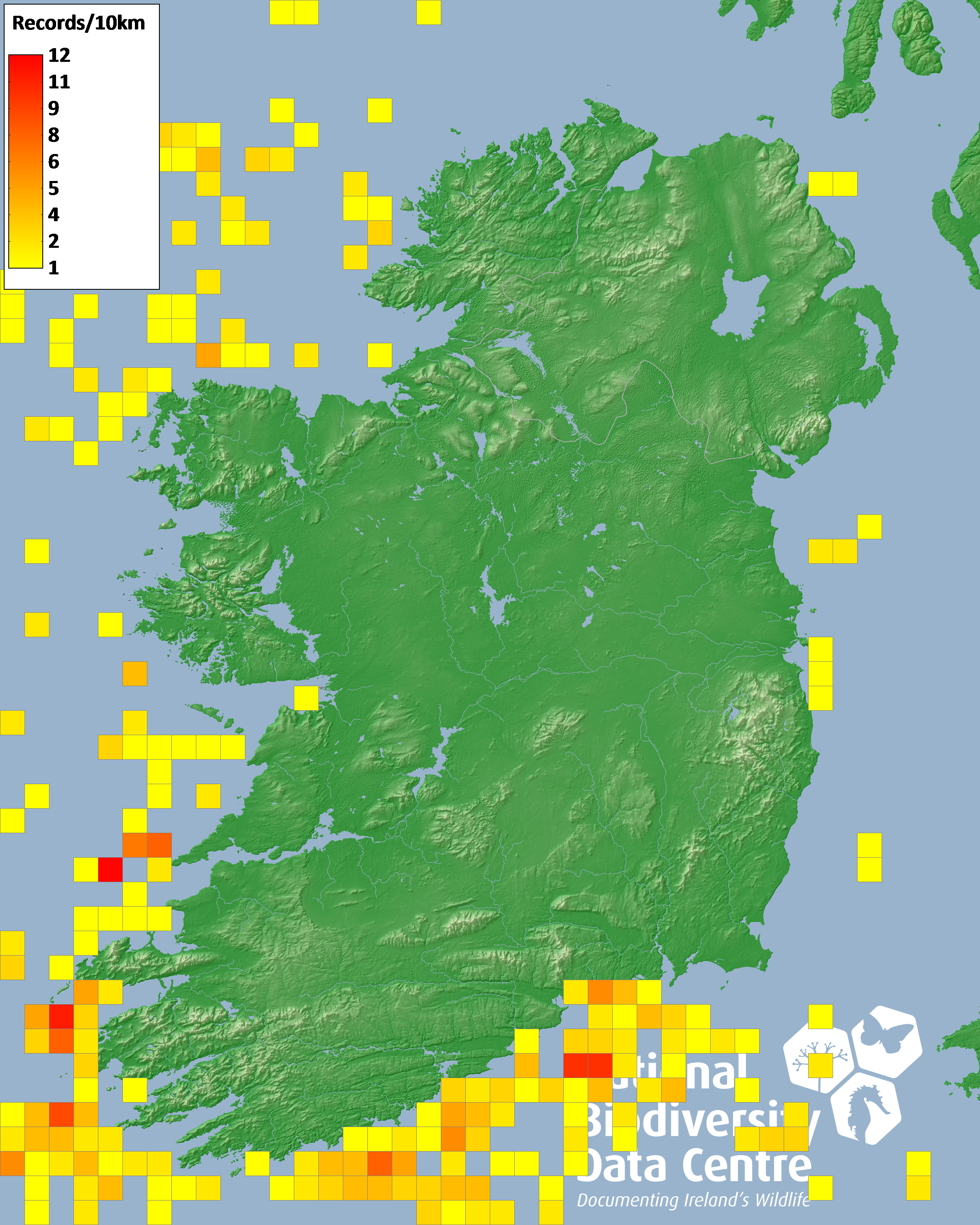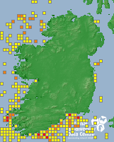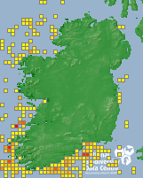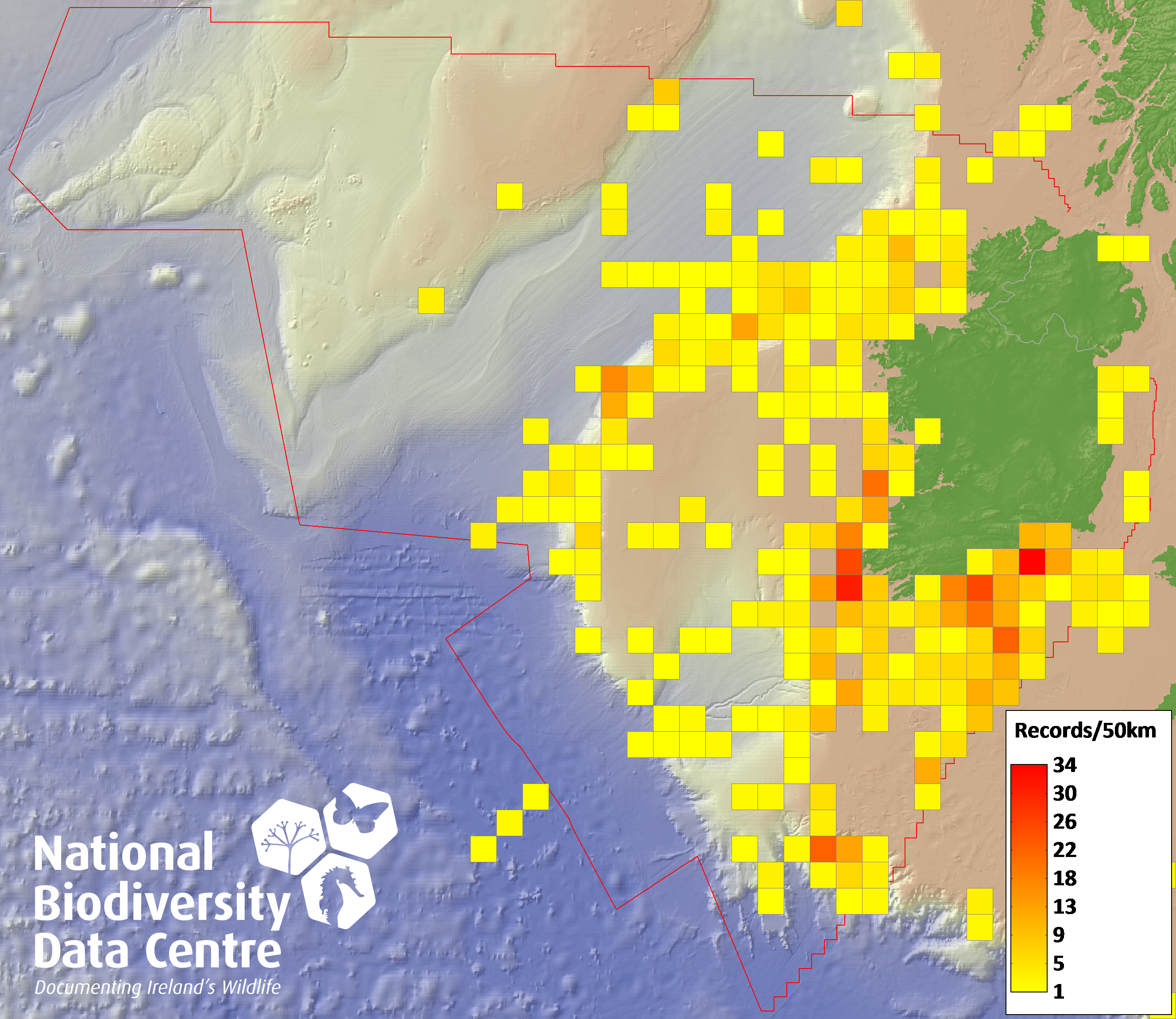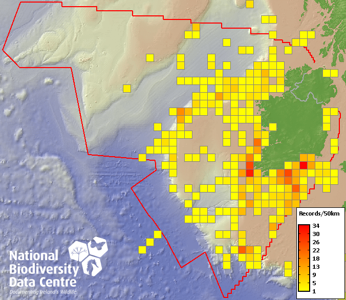 Distribution of the number of records within each 10km grid square (ITM).Marine Map - 50Km