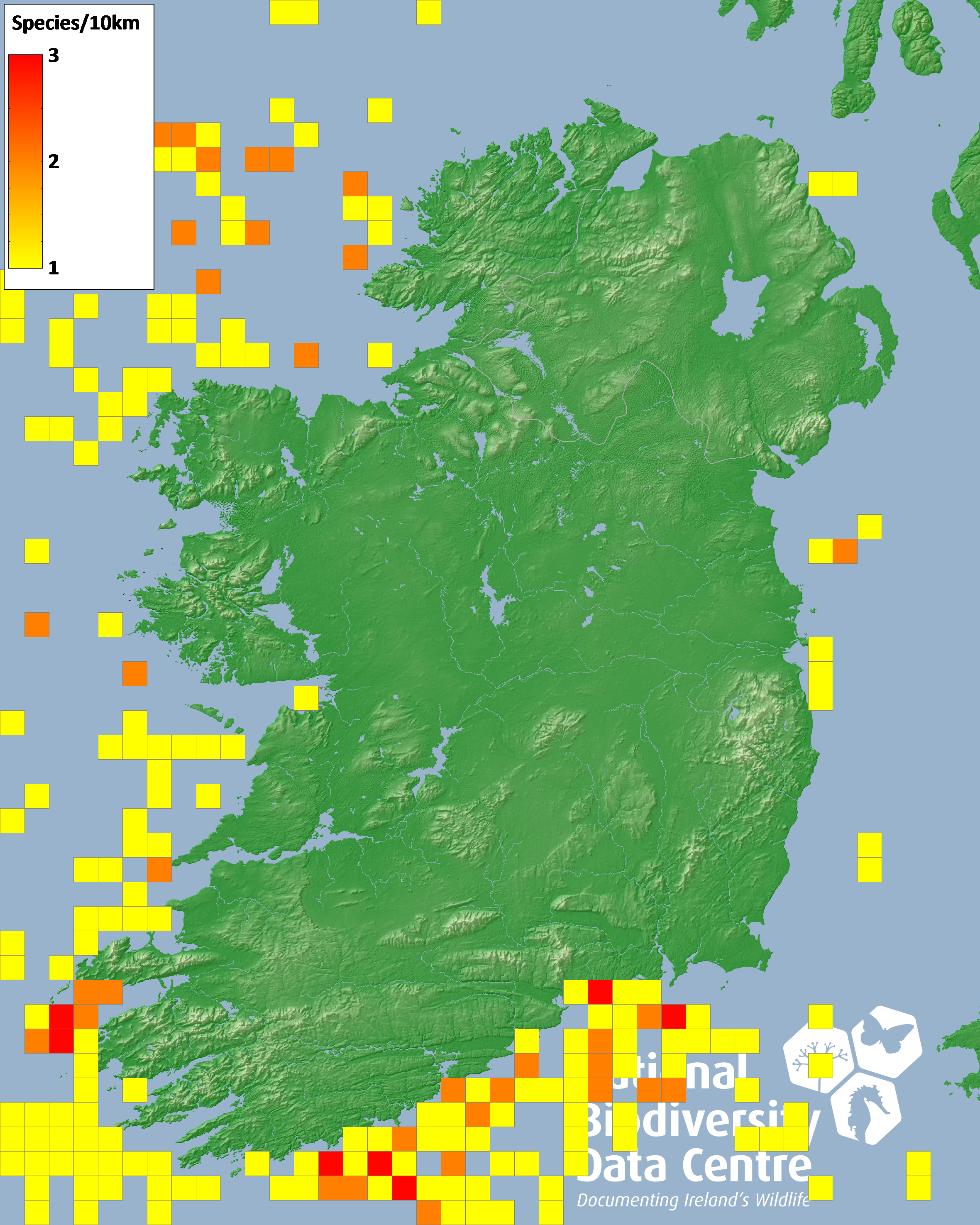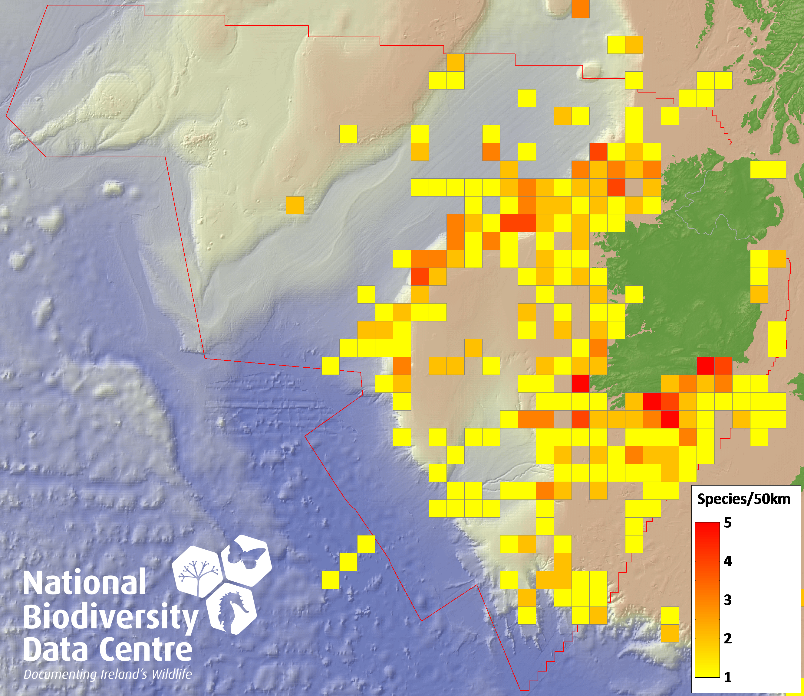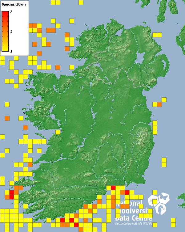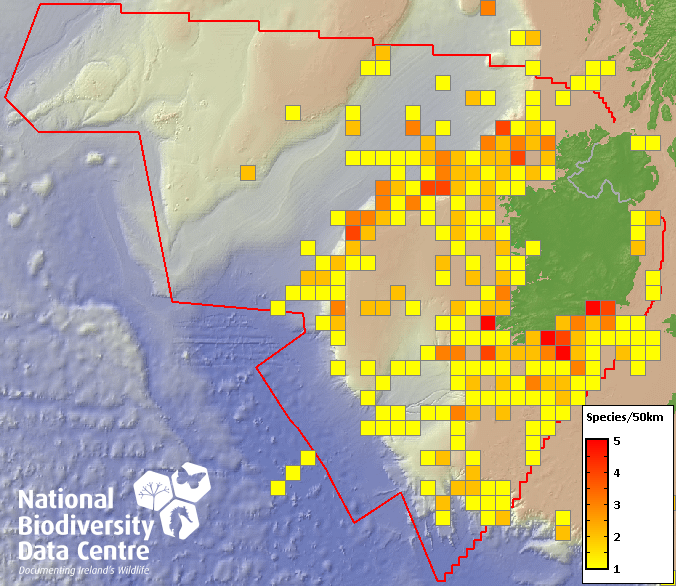 Distribution of the number of species recorded within each 10km grid square (ITM).Marine Map - 50Km