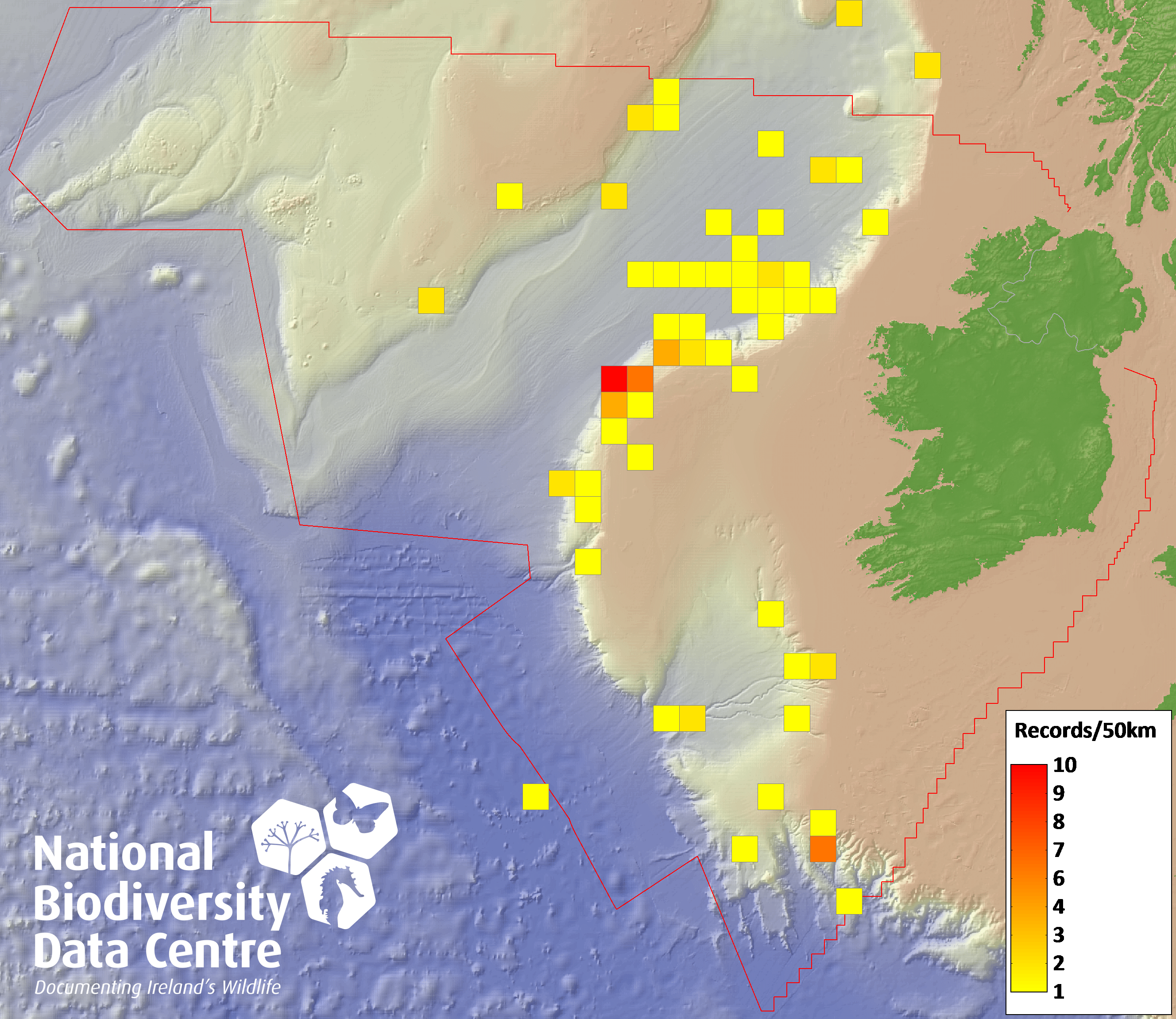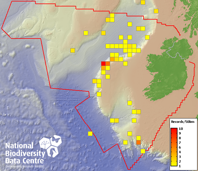 Distribution of the number of records recorded within each 10km grid square (ITM).Marine Map - 50km