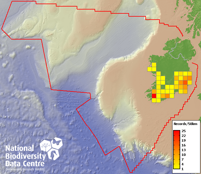 Distribution of the number of records recorded within each 10km grid square (ITM).Marine Map - 50km