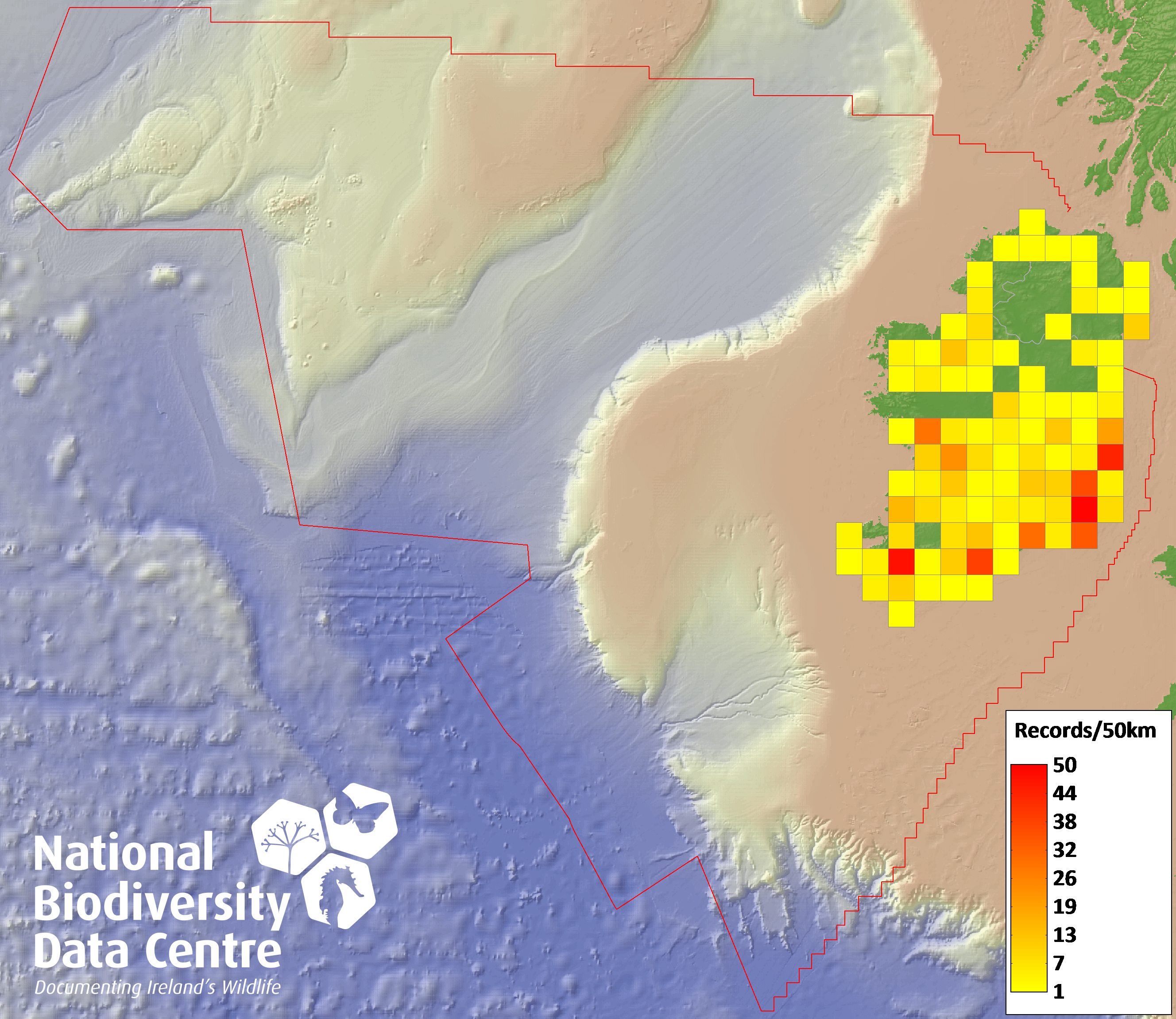 Distribution of the number of records recorded within each 10km grid square (ITM).Marine Map - 50km