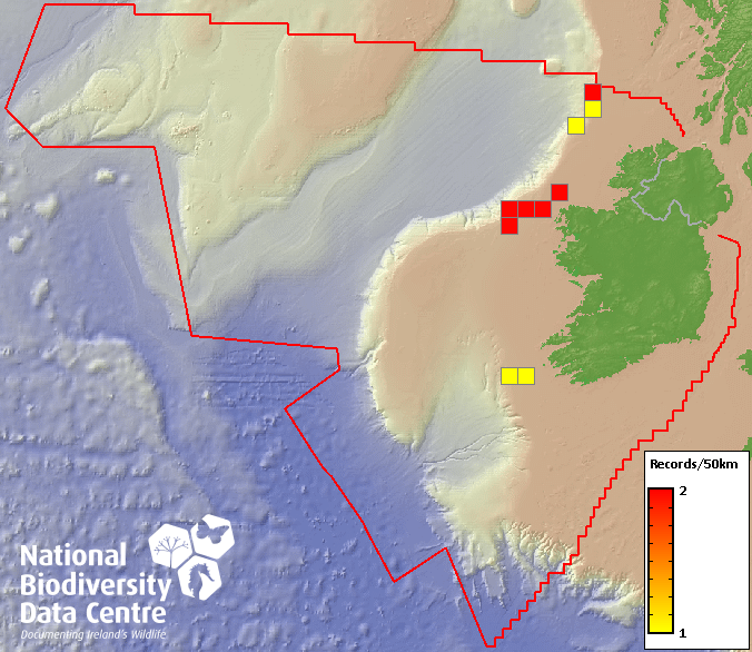 Distribution of the number of records recorded within each 10km grid square (ITM).Marine Map - 50km