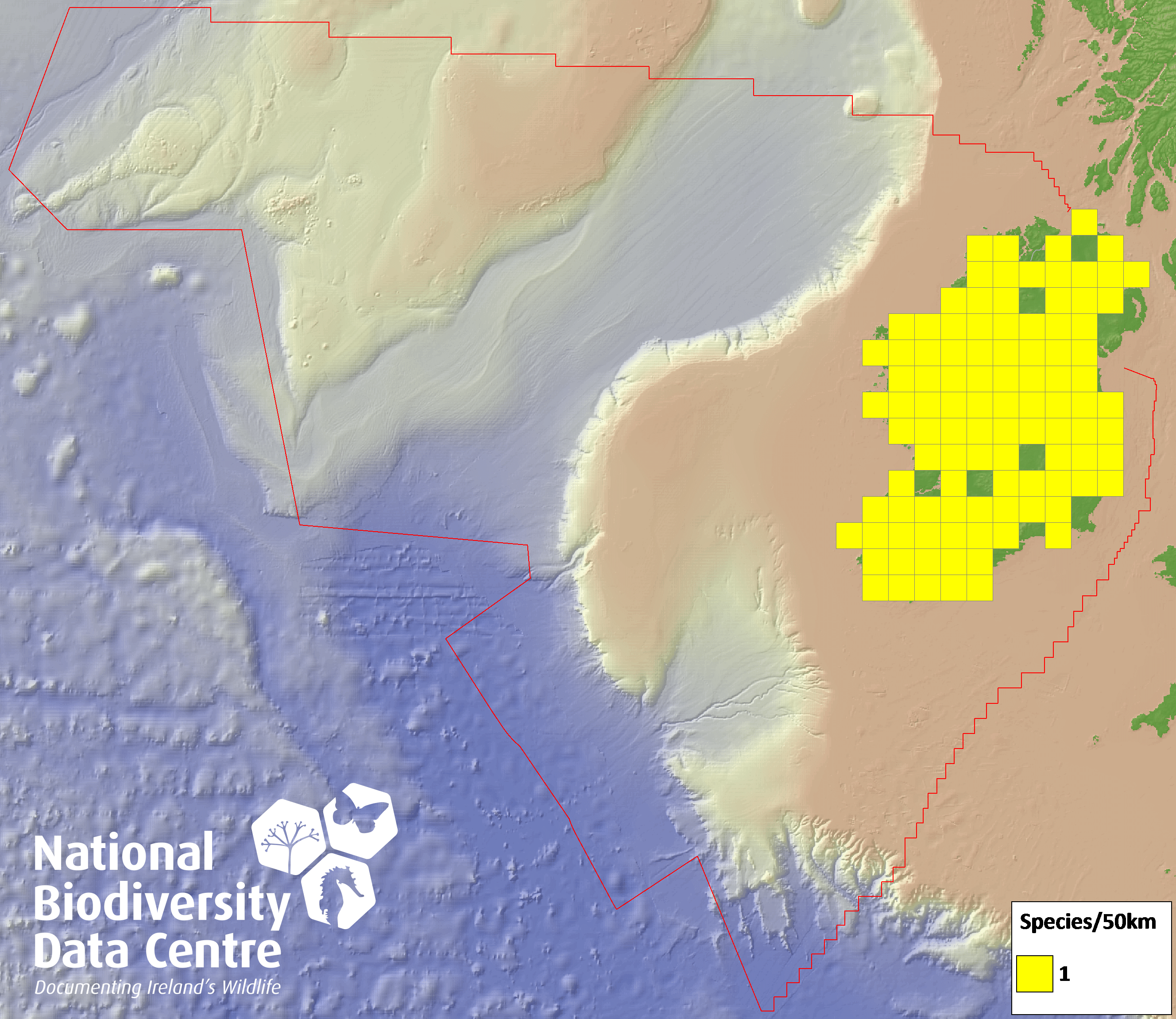 Distribution of the number of records within each 10km grid square (ITM).Marine Map - 50Km