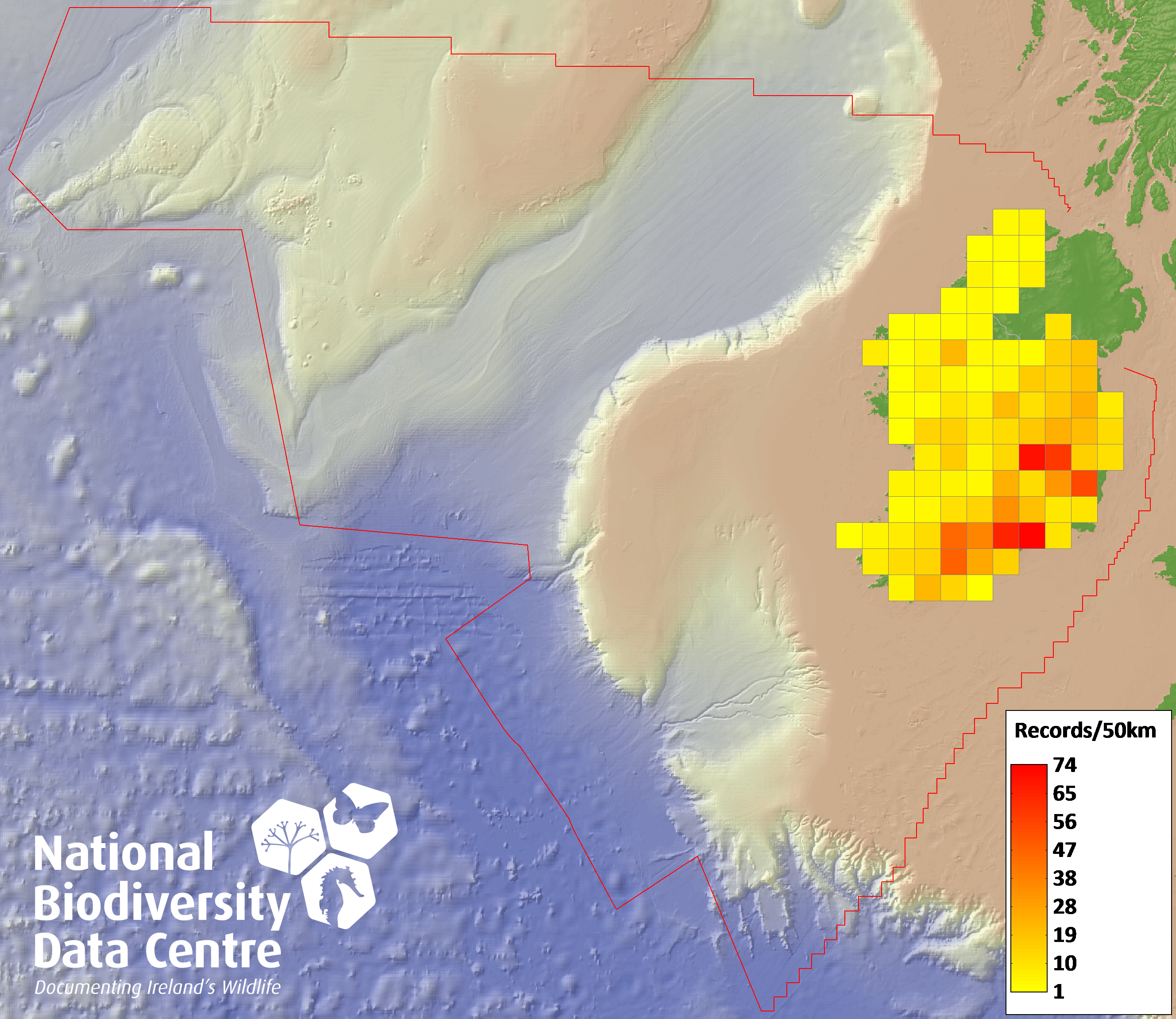 Distribution of the number of records within each 10km grid square (ITM).Marine Map - 50Km