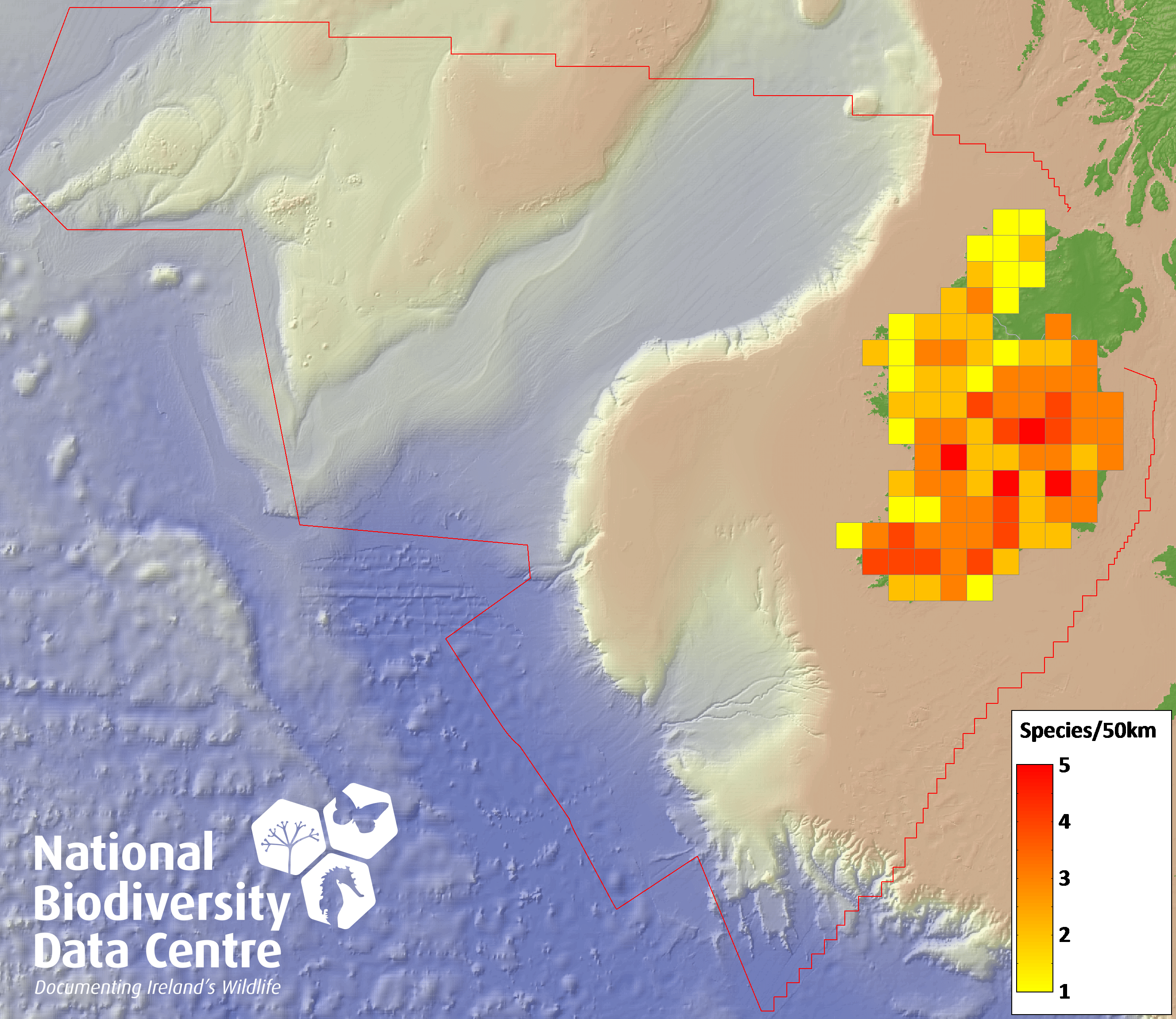 Distribution of the number of species recorded within each 10km grid square (ITM).Marine Map - 50Km
