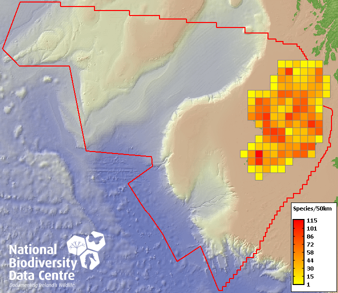 Distribution of the number of species recorded within each 10km grid square (ITM).Marine Map - 50Km