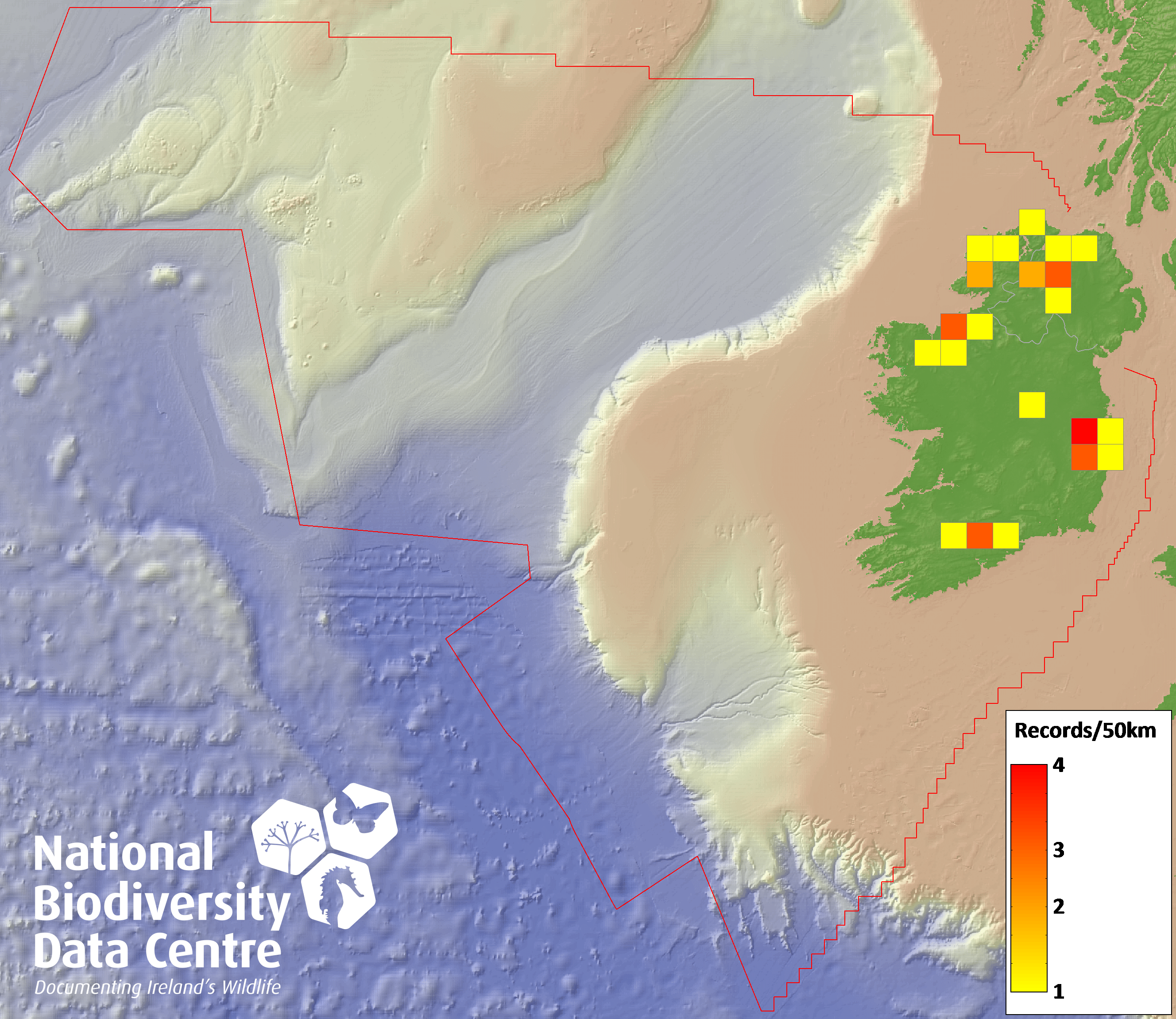 Distribution of the number of records recorded within each 10km grid square (ITM).Marine Map - 50km