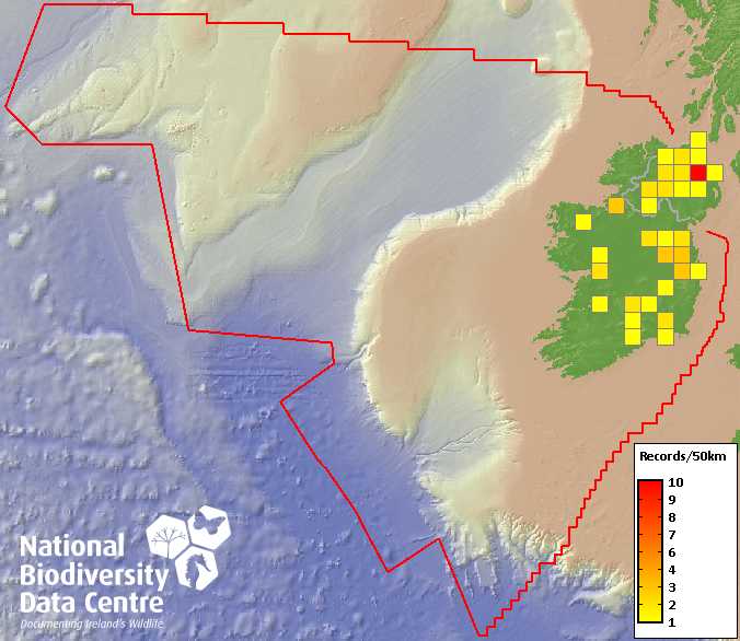 Distribution of the number of records recorded within each 10km grid square (ITM).Marine Map - 50km