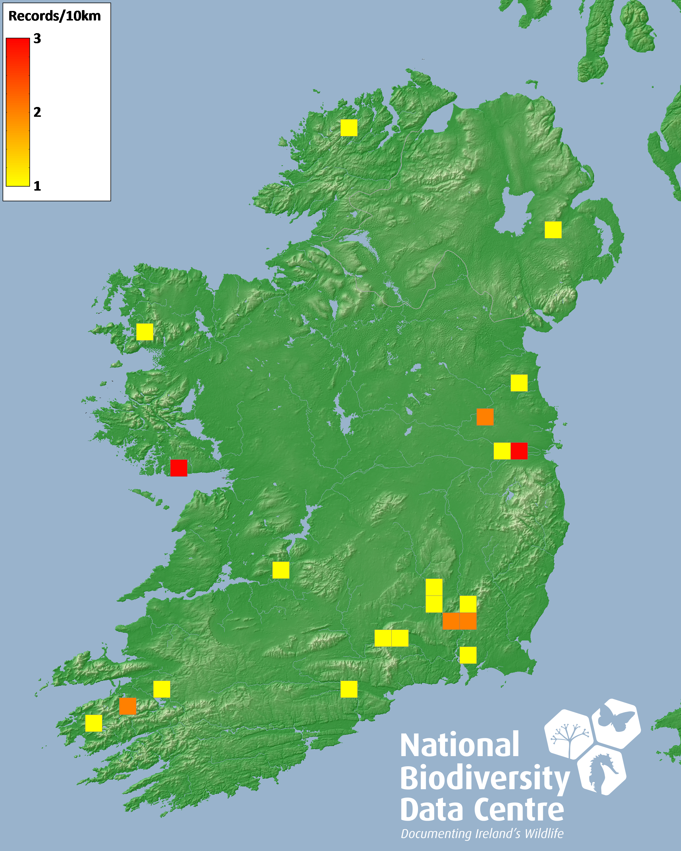 Distribution of the number of records recorded within each 10km grid square (ITM).Marine Map - 50km