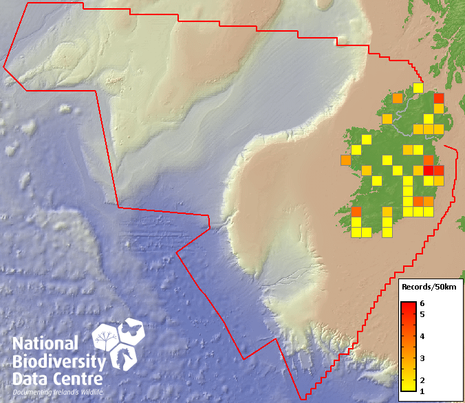 Distribution of the number of records recorded within each 10km grid square (ITM).Marine Map - 50km
