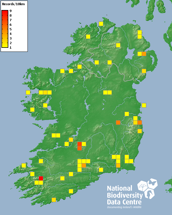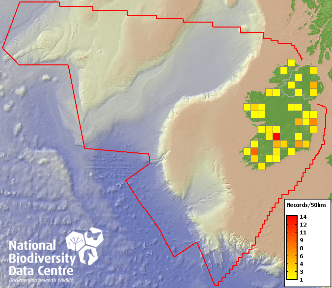 Distribution of the number of records recorded within each 10km grid square (ITM).Marine Map - 50km