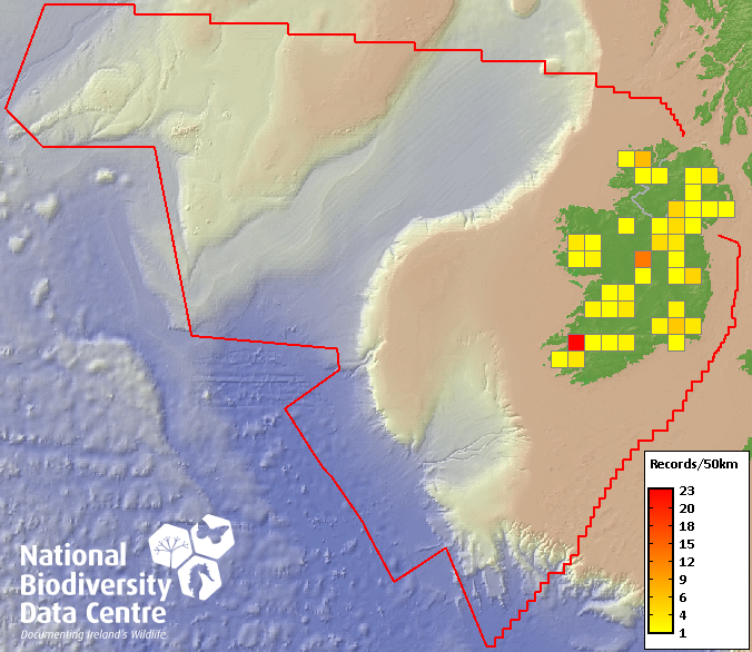 Distribution of the number of records recorded within each 10km grid square (ITM).Marine Map - 50km