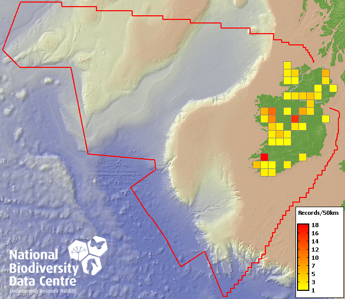 Distribution of the number of records recorded within each 10km grid square (ITM).Marine Map - 50km