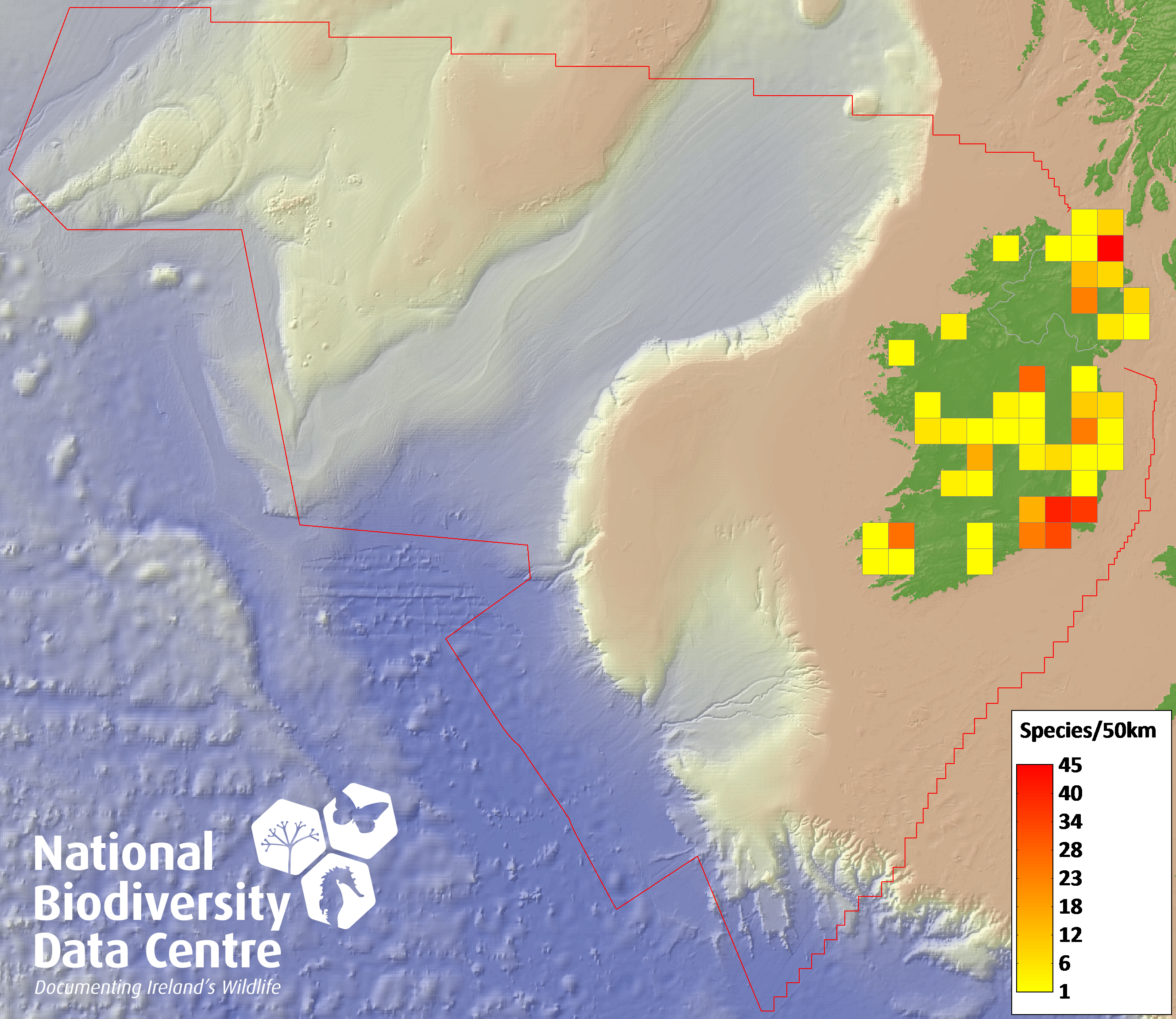Distribution of the number of species recorded within each 10km grid square (ITM).Marine Map - 50Km
