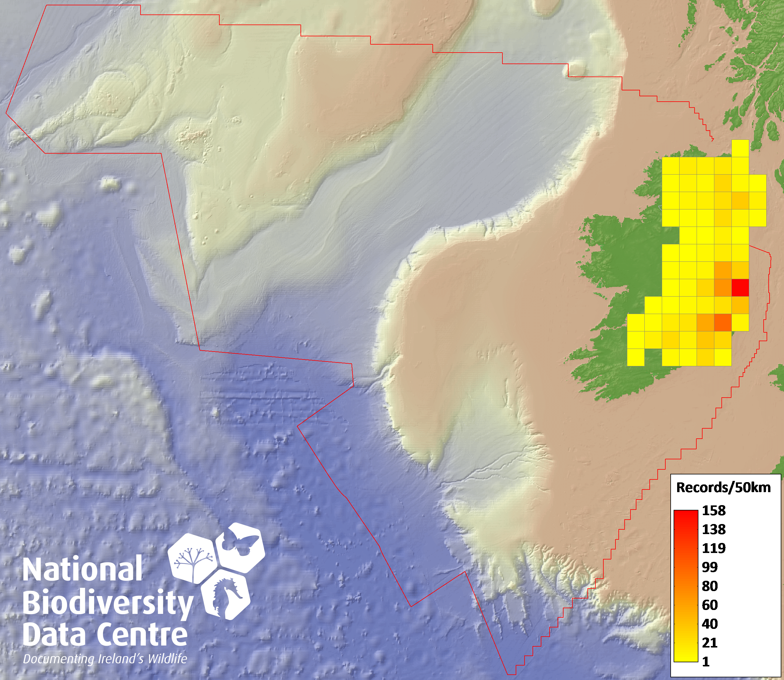 Distribution of the number of records recorded within each 10km grid square (ITM).Marine Map - 50km
