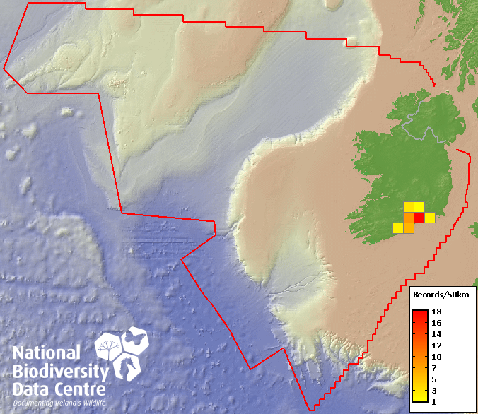 Distribution of the number of records within each 10km grid square (ITM).Marine Map - 50Km