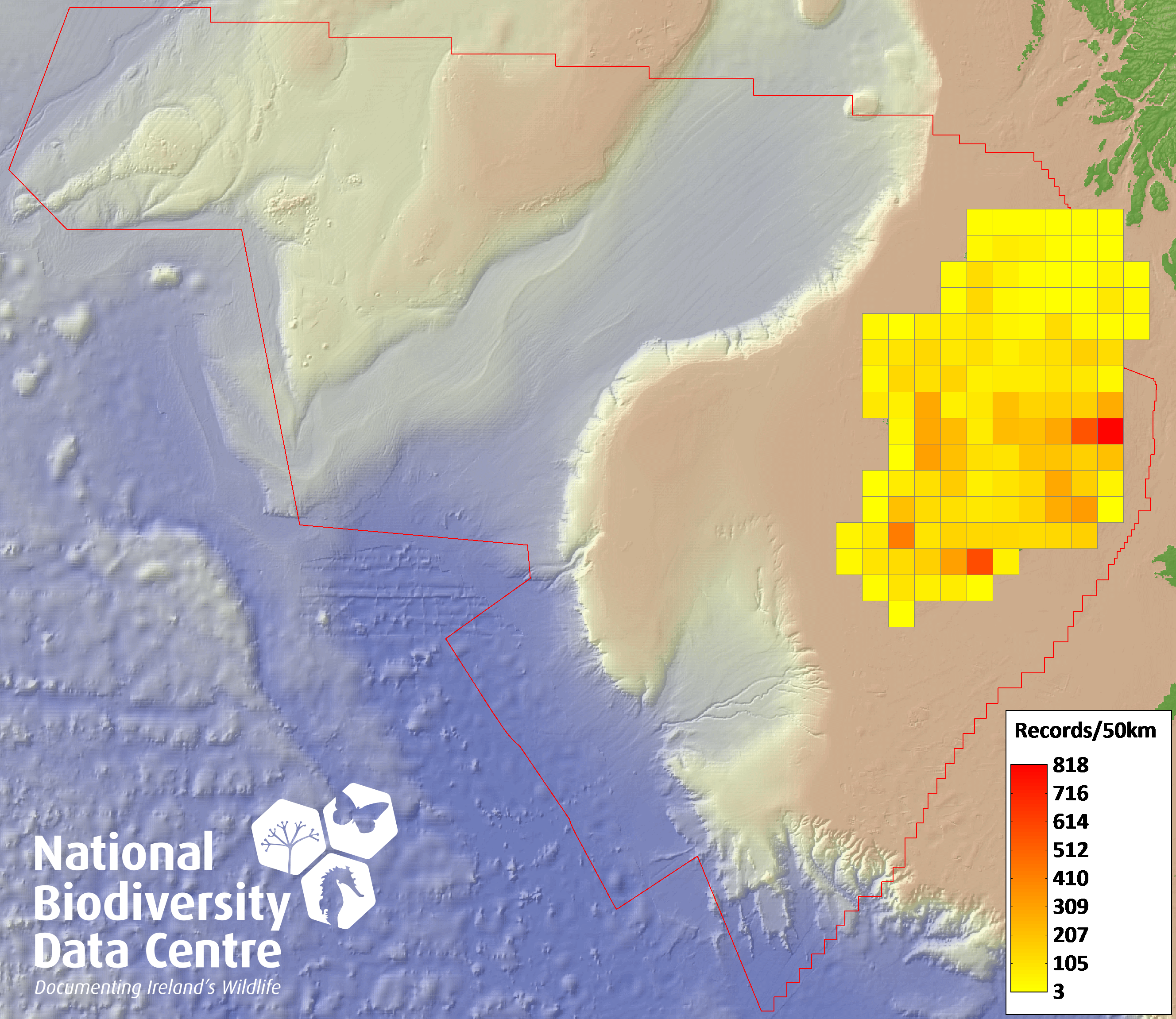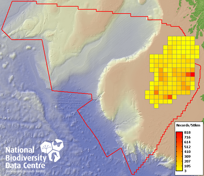 Distribution of the number of records within each 10km grid square (ITM).Marine Map - 50Km