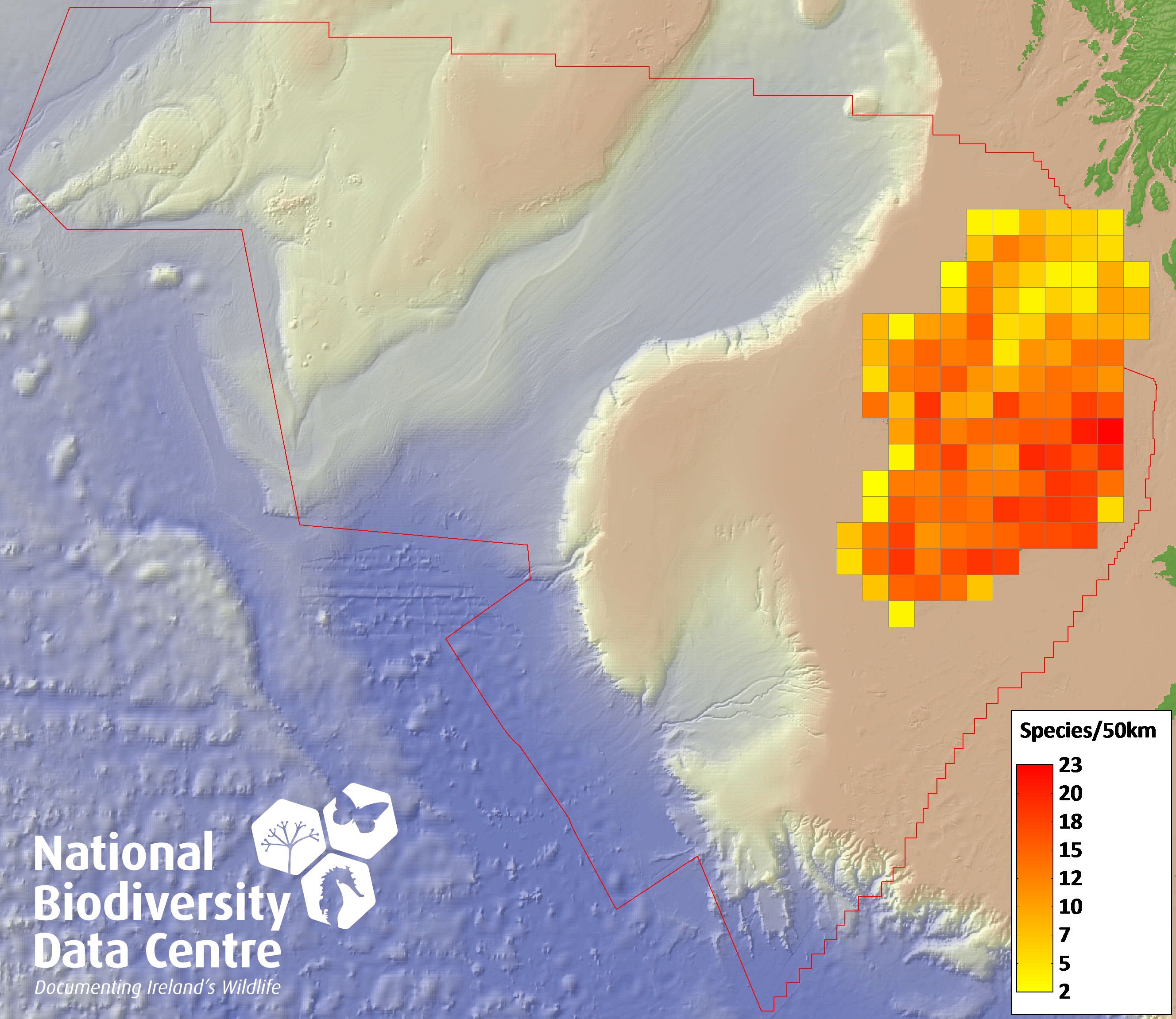 Distribution of the number of species recorded within each 10km grid square (ITM).Marine Map - 50Km