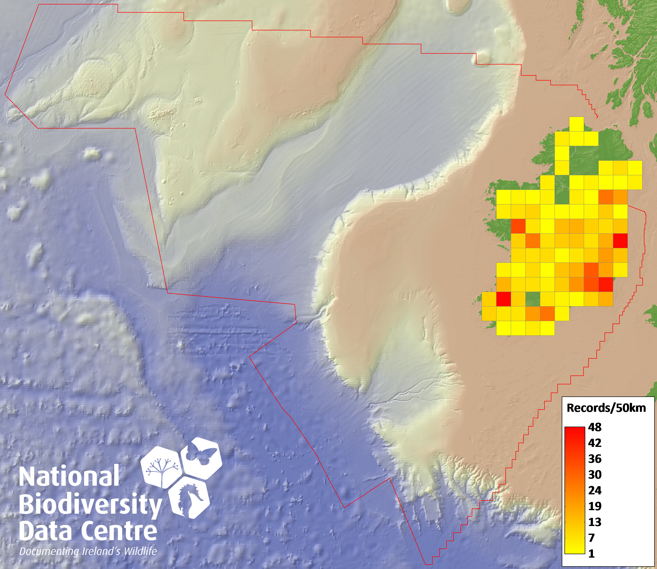 Distribution of the number of records recorded within each 10km grid square (ITM).Marine Map - 50km