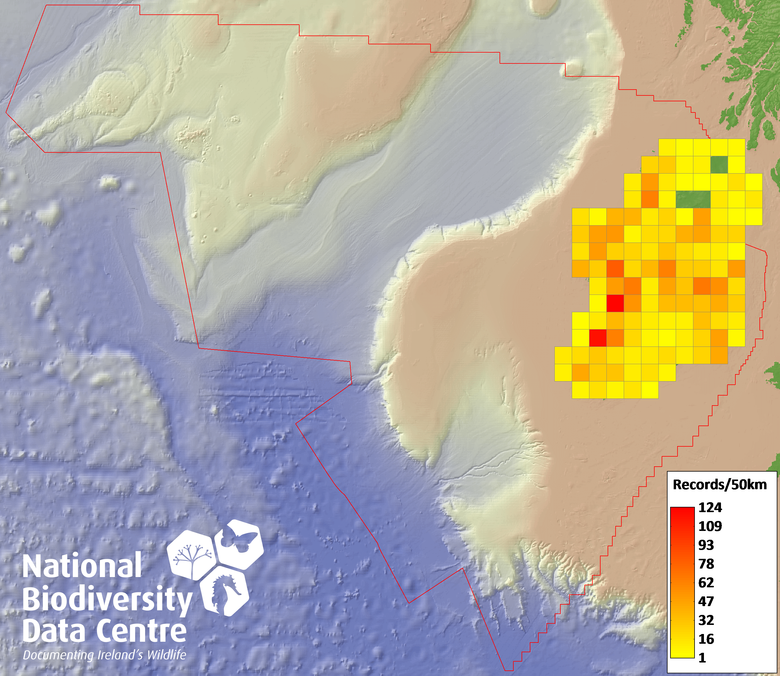 Distribution of the number of records recorded within each 10km grid square (ITM).Marine Map - 50km