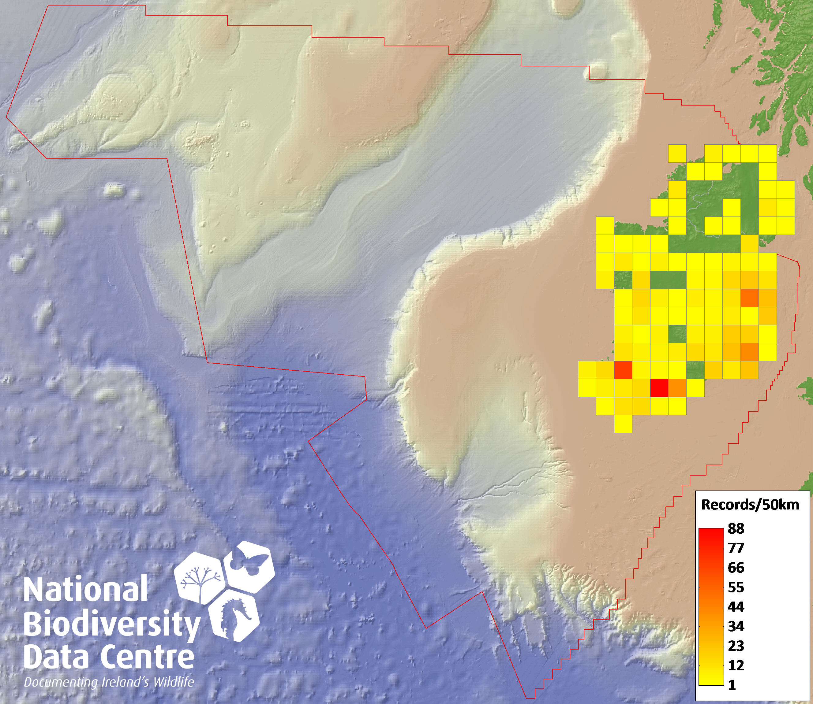 Distribution of the number of records recorded within each 10km grid square (ITM).Marine Map - 50km