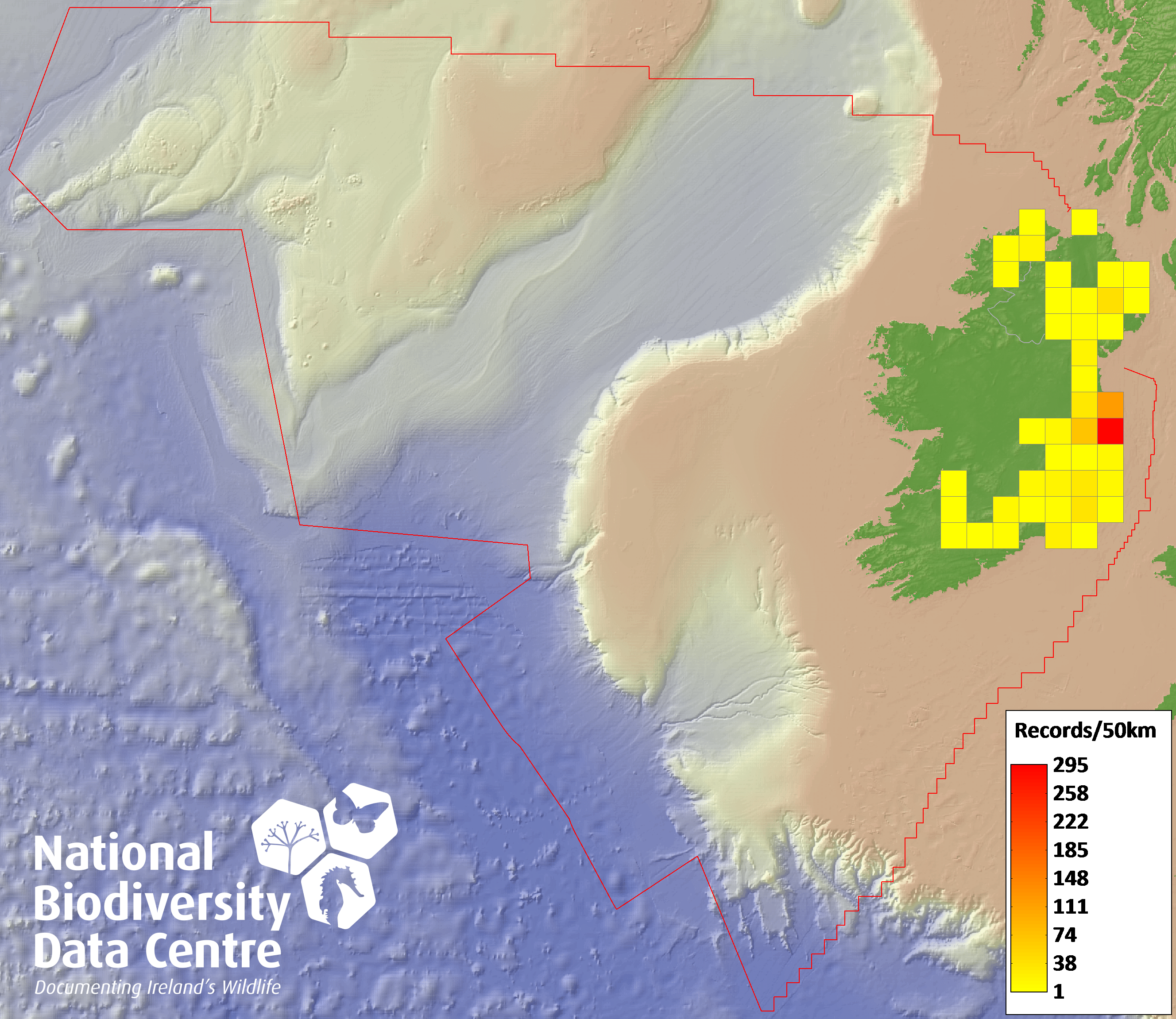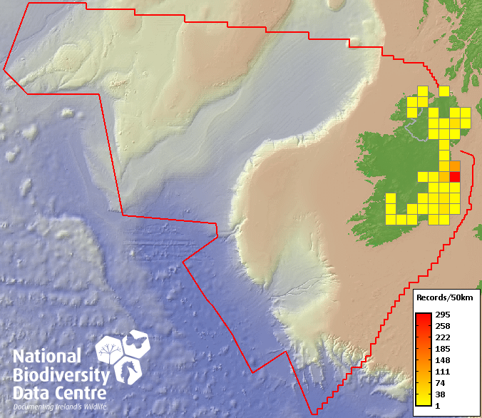 Distribution of the number of records recorded within each 10km grid square (ITM).Marine Map - 50km