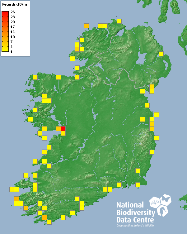 Distribution of the number of records recorded within each 10km grid square (ITM).Marine Map - 50km