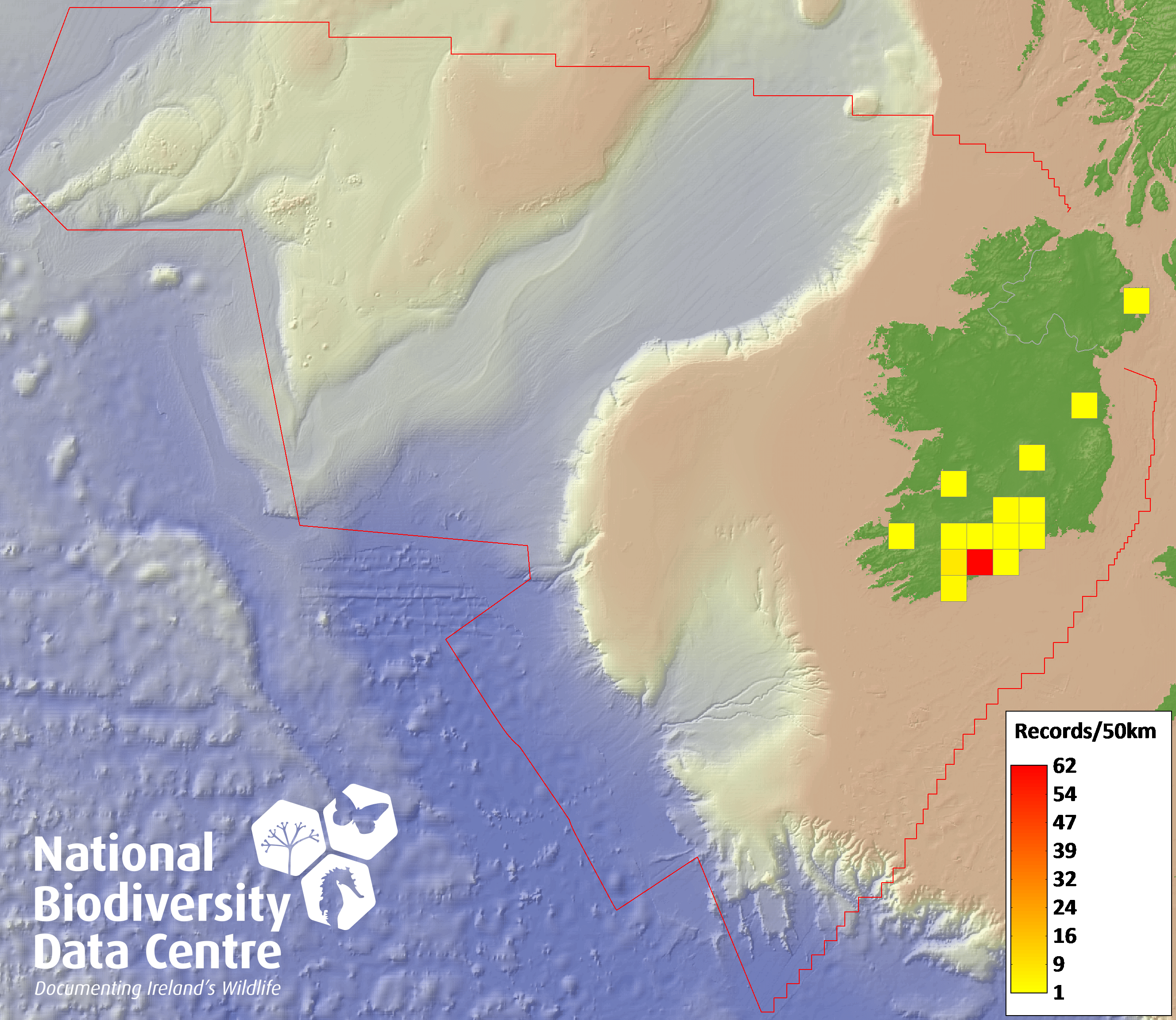 Distribution of the number of records recorded within each 10km grid square (ITM).Marine Map - 50km
