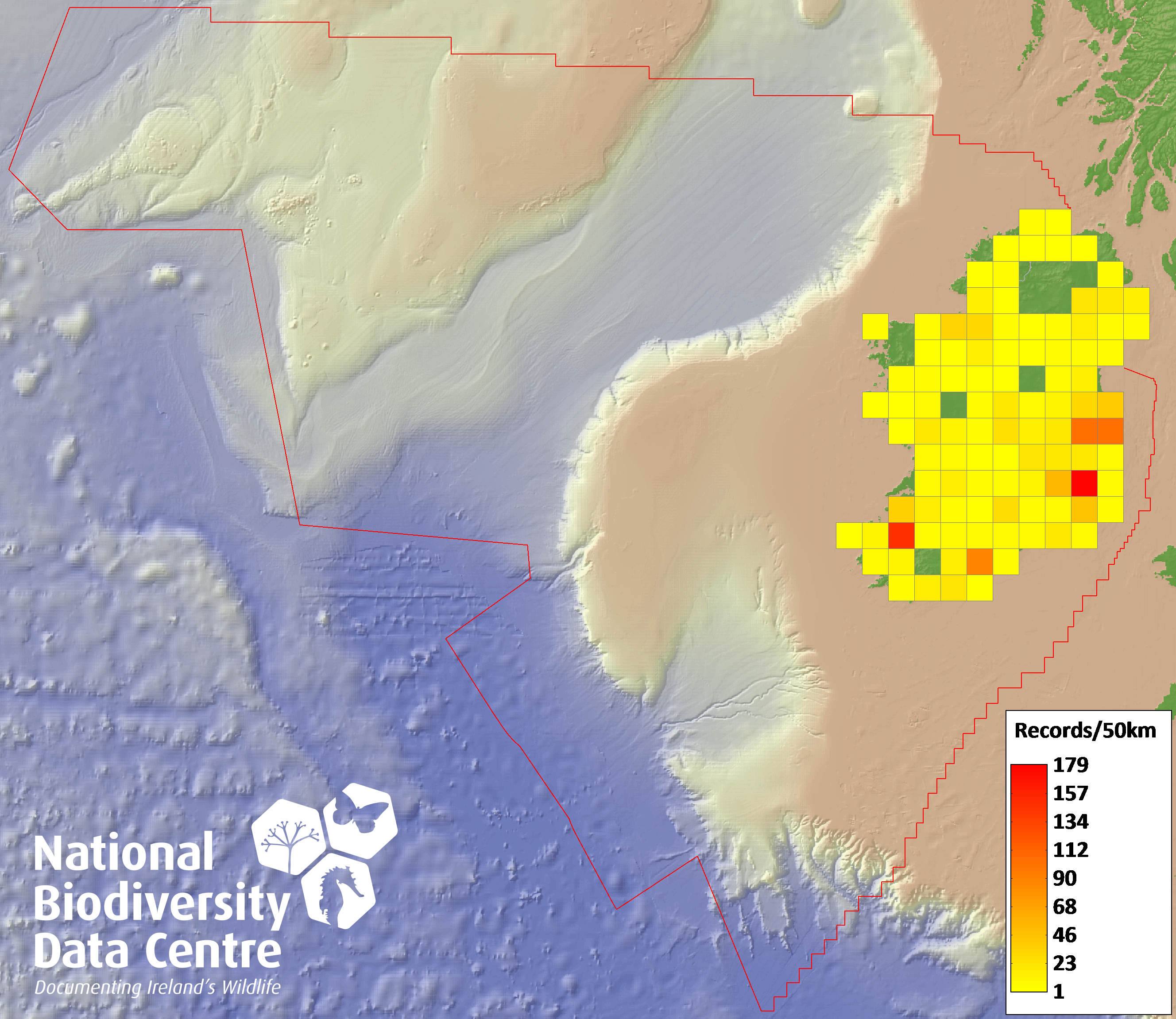 Distribution of the number of records recorded within each 10km grid square (ITM).Marine Map - 50km