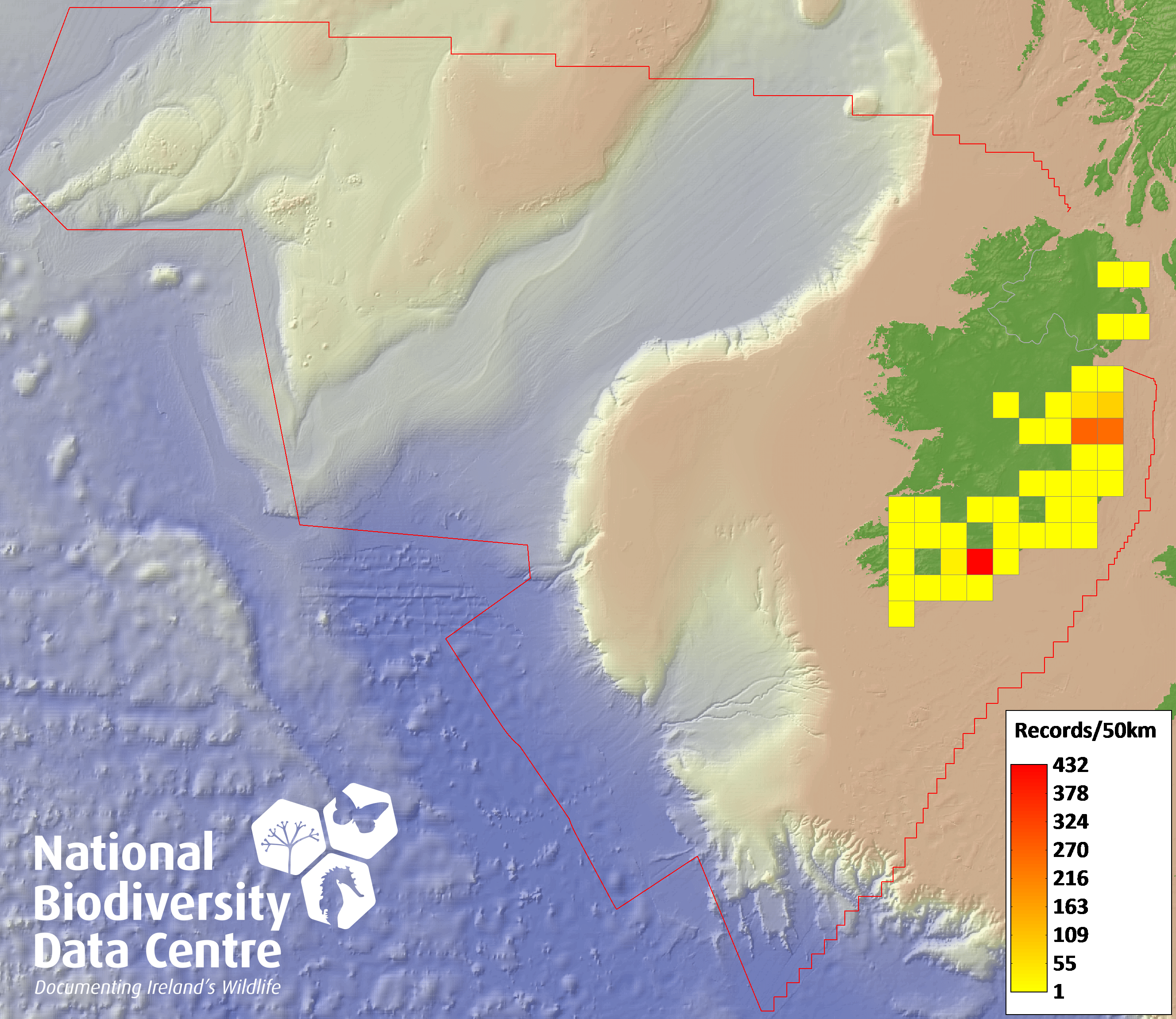 Distribution of the number of records recorded within each 10km grid square (ITM).Marine Map - 50km