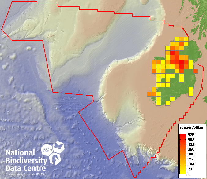 Distribution of the number of species recorded within each 10km grid square (ITM).Marine Map - 50Km