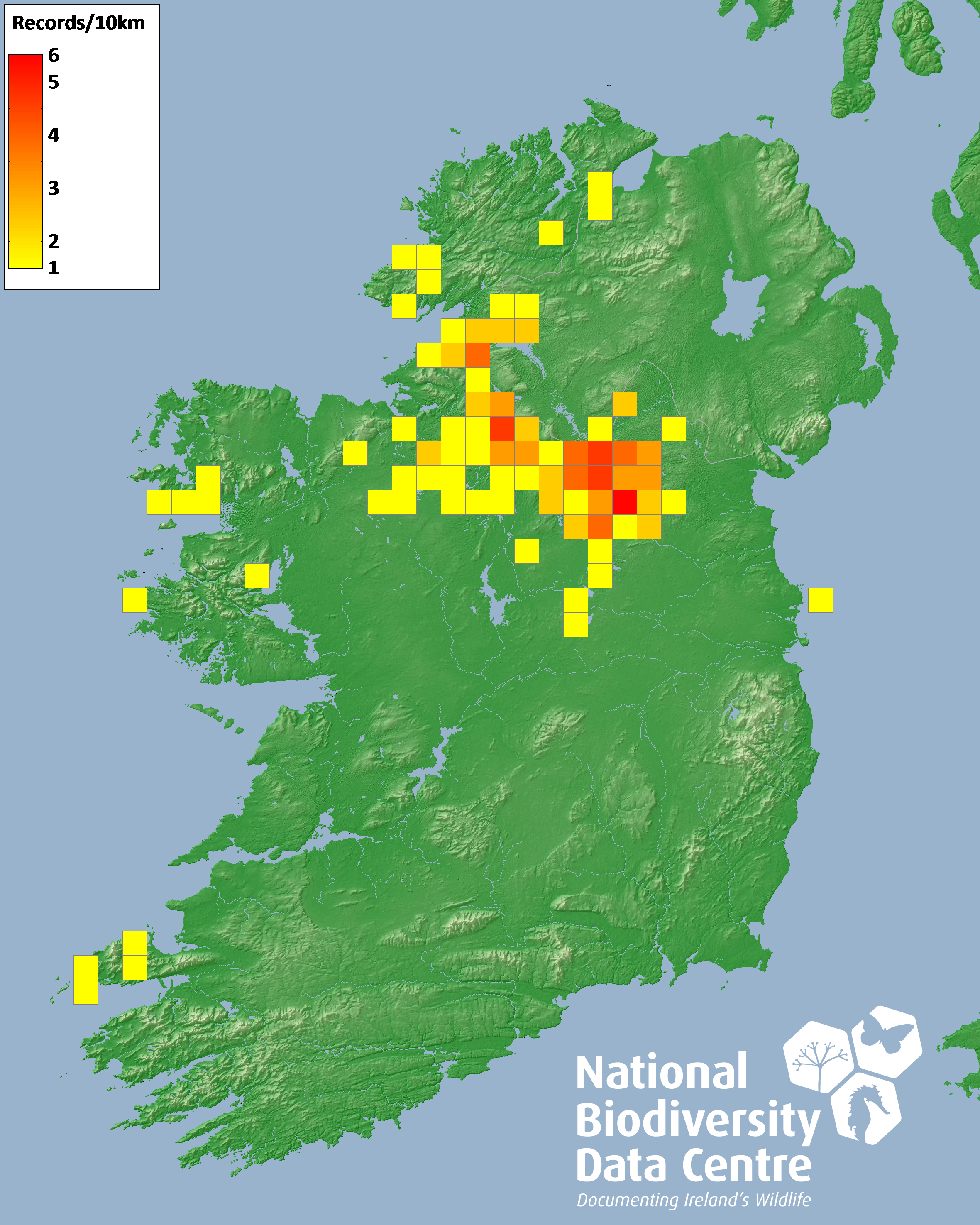 Distribution of the number of records recorded within each 10km grid square (ITM).Marine Map - 50km