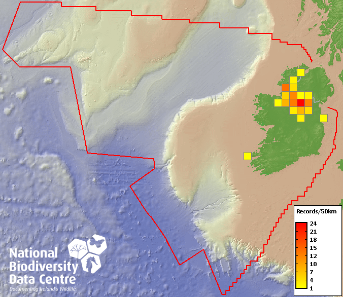 Distribution of the number of records recorded within each 10km grid square (ITM).Marine Map - 50km