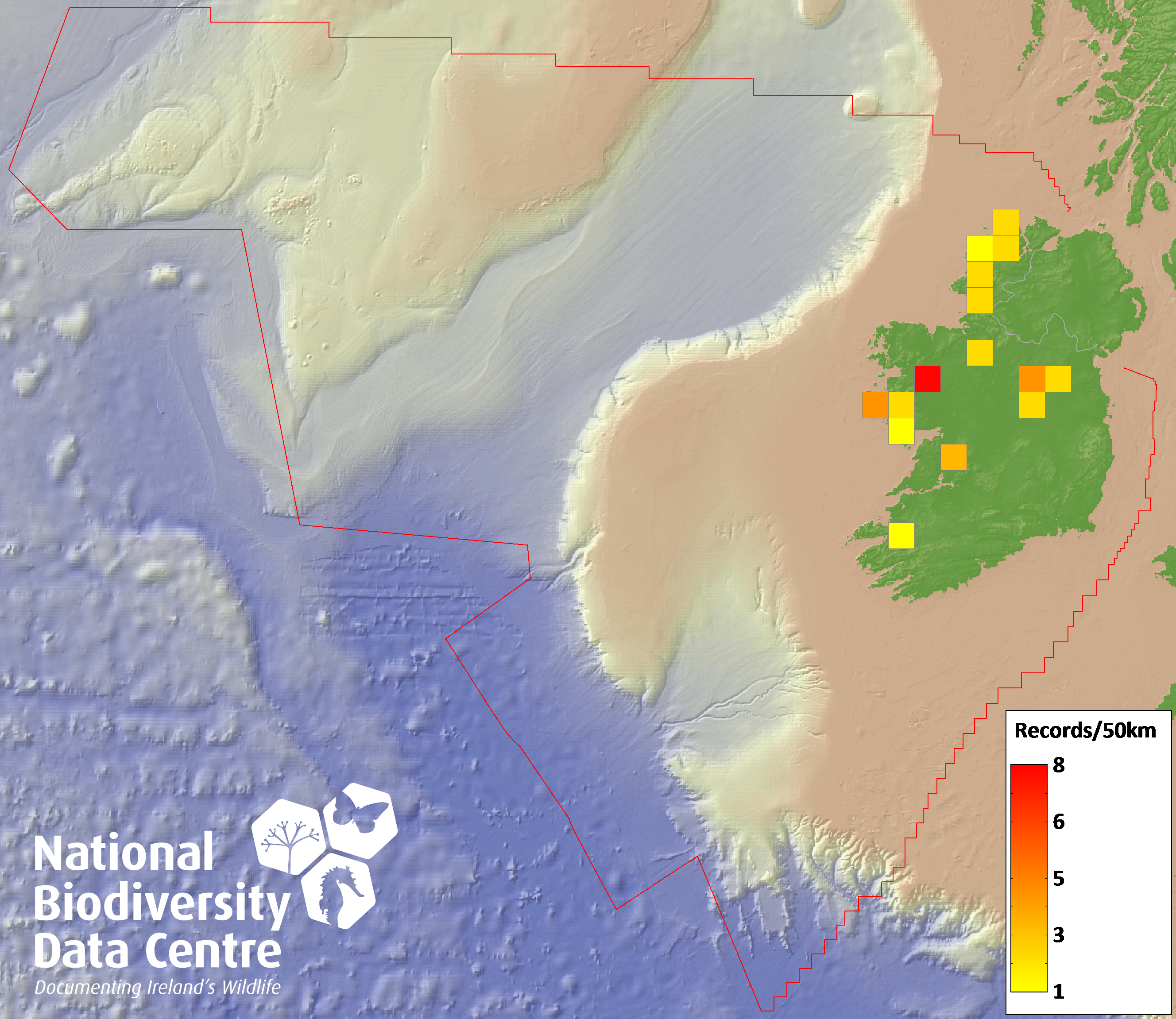 Distribution of the number of records recorded within each 10km grid square (ITM).Marine Map - 50km