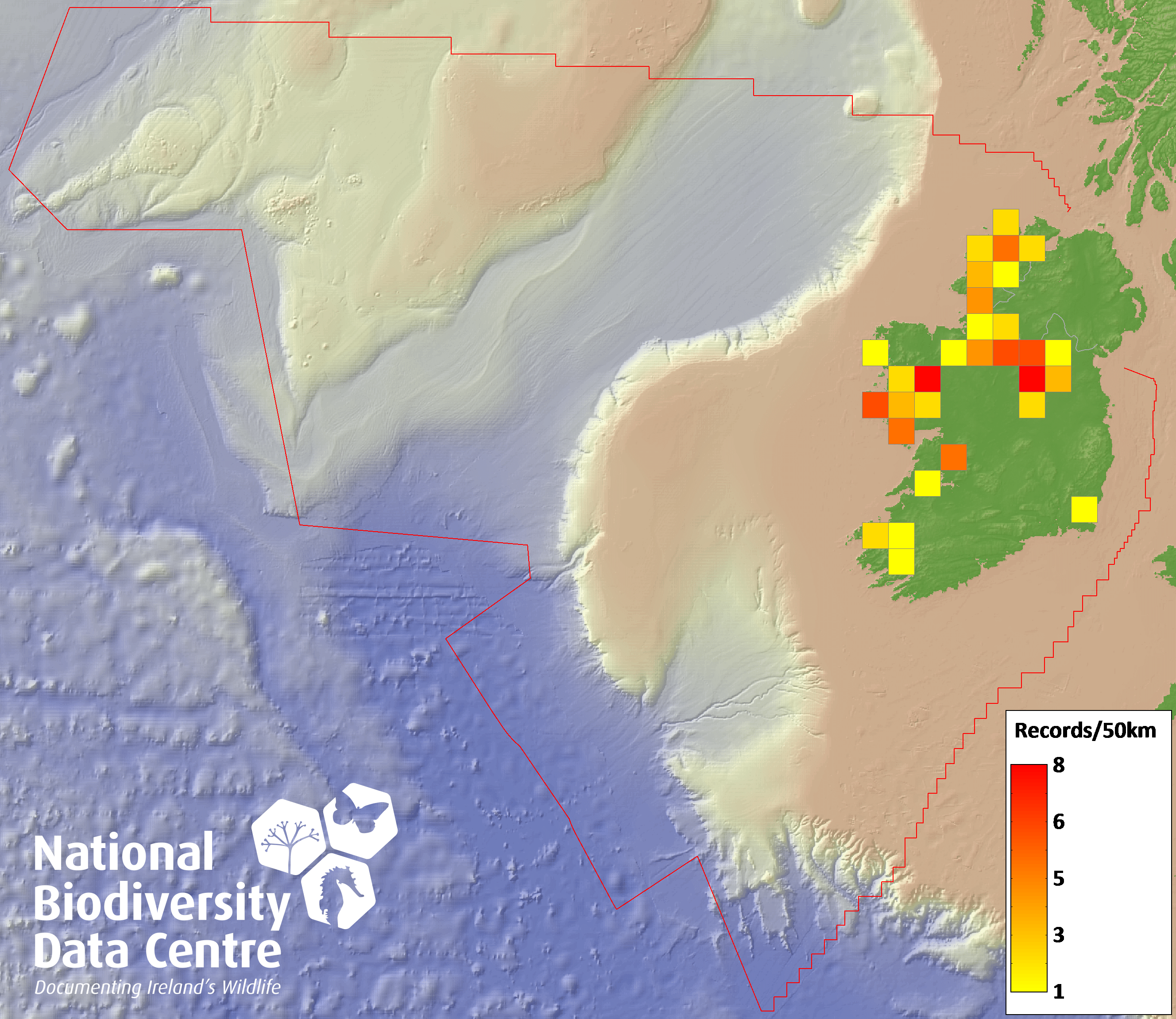 Distribution of the number of records recorded within each 10km grid square (ITM).Marine Map - 50km