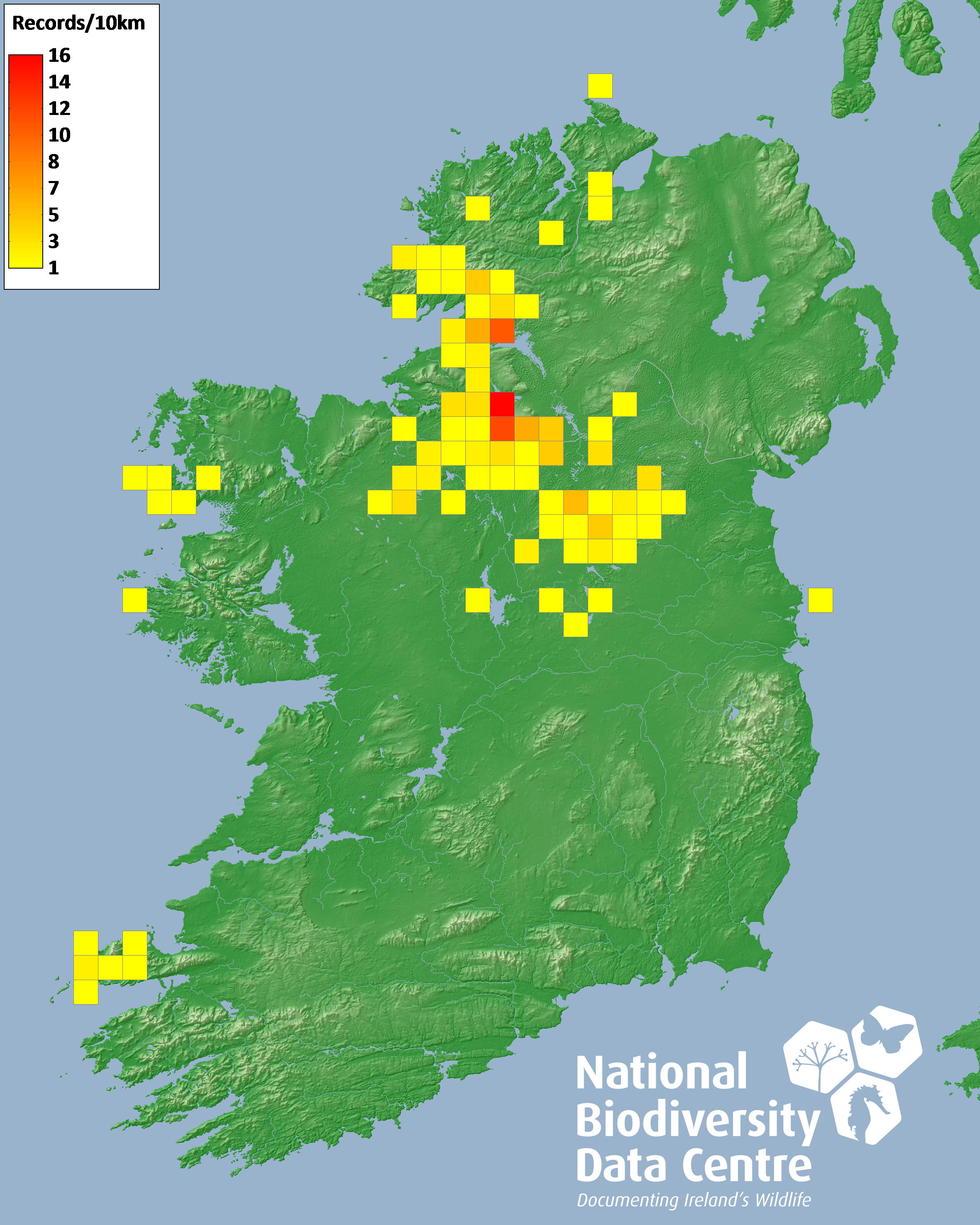 Distribution of the number of records recorded within each 10km grid square (ITM).Marine Map - 50km