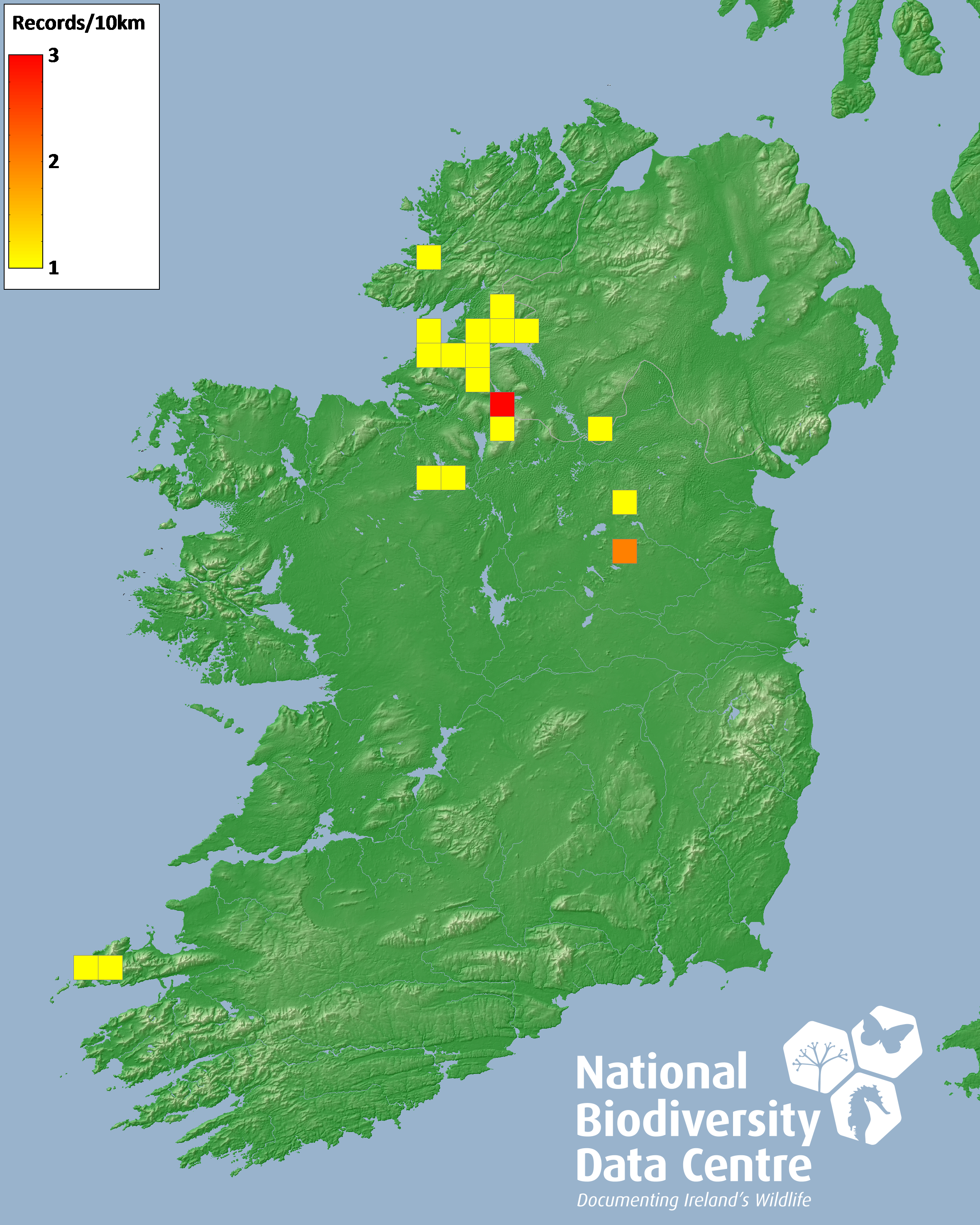 Distribution of the number of records recorded within each 10km grid square (ITM).Marine Map - 50km