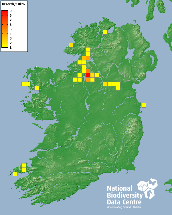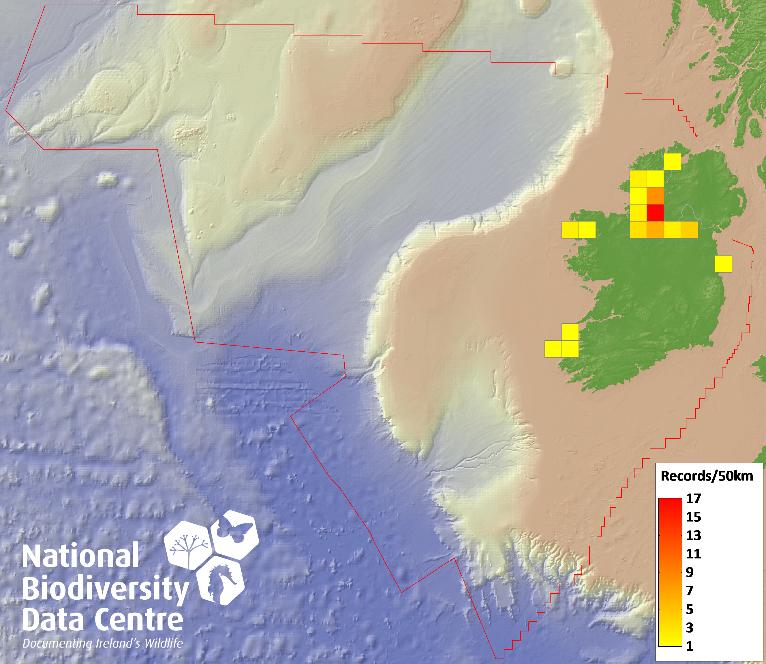 Distribution of the number of records recorded within each 10km grid square (ITM).Marine Map - 50km