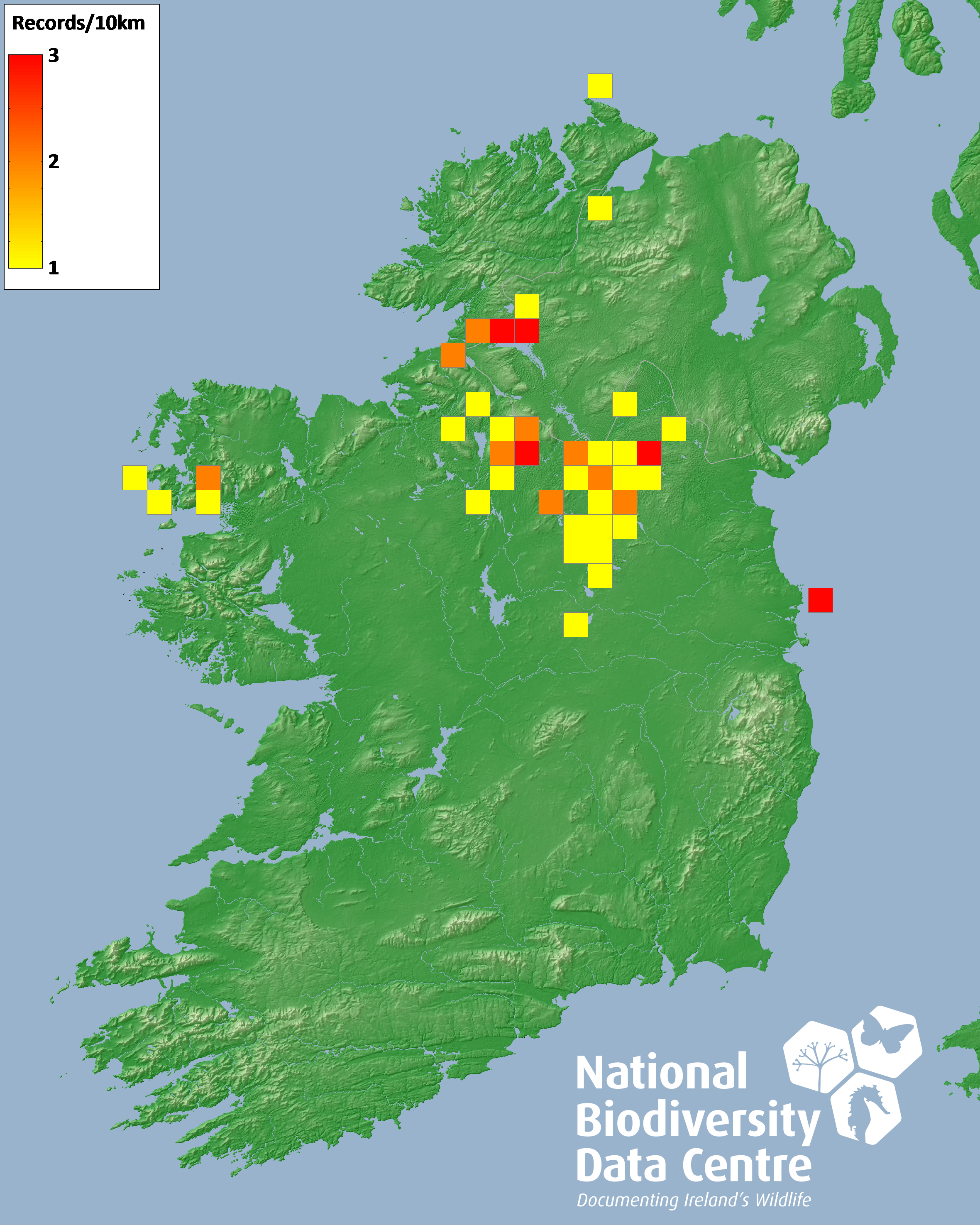 Distribution of the number of records recorded within each 10km grid square (ITM).Marine Map - 50km