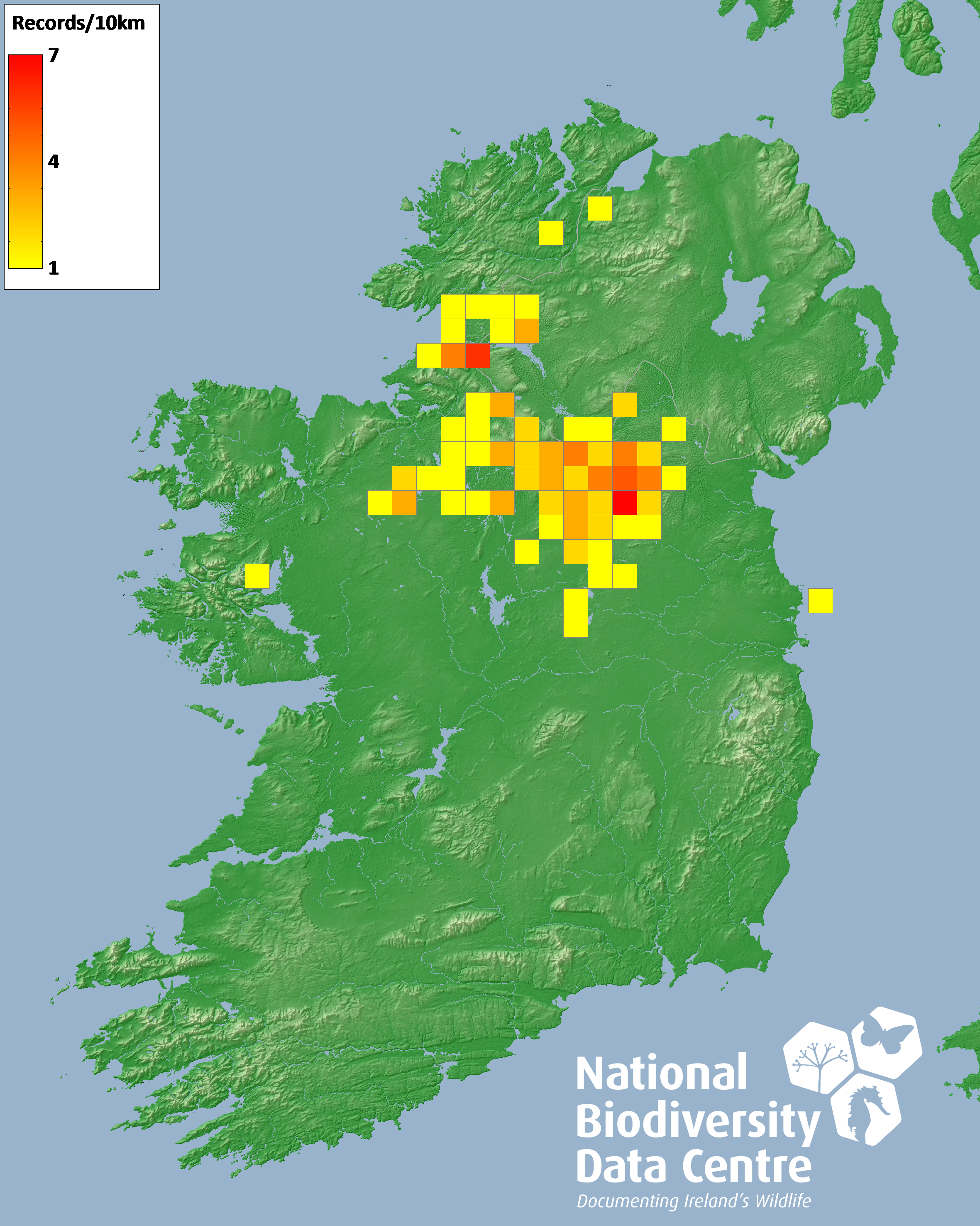 Distribution of the number of records recorded within each 10km grid square (ITM).Marine Map - 50km