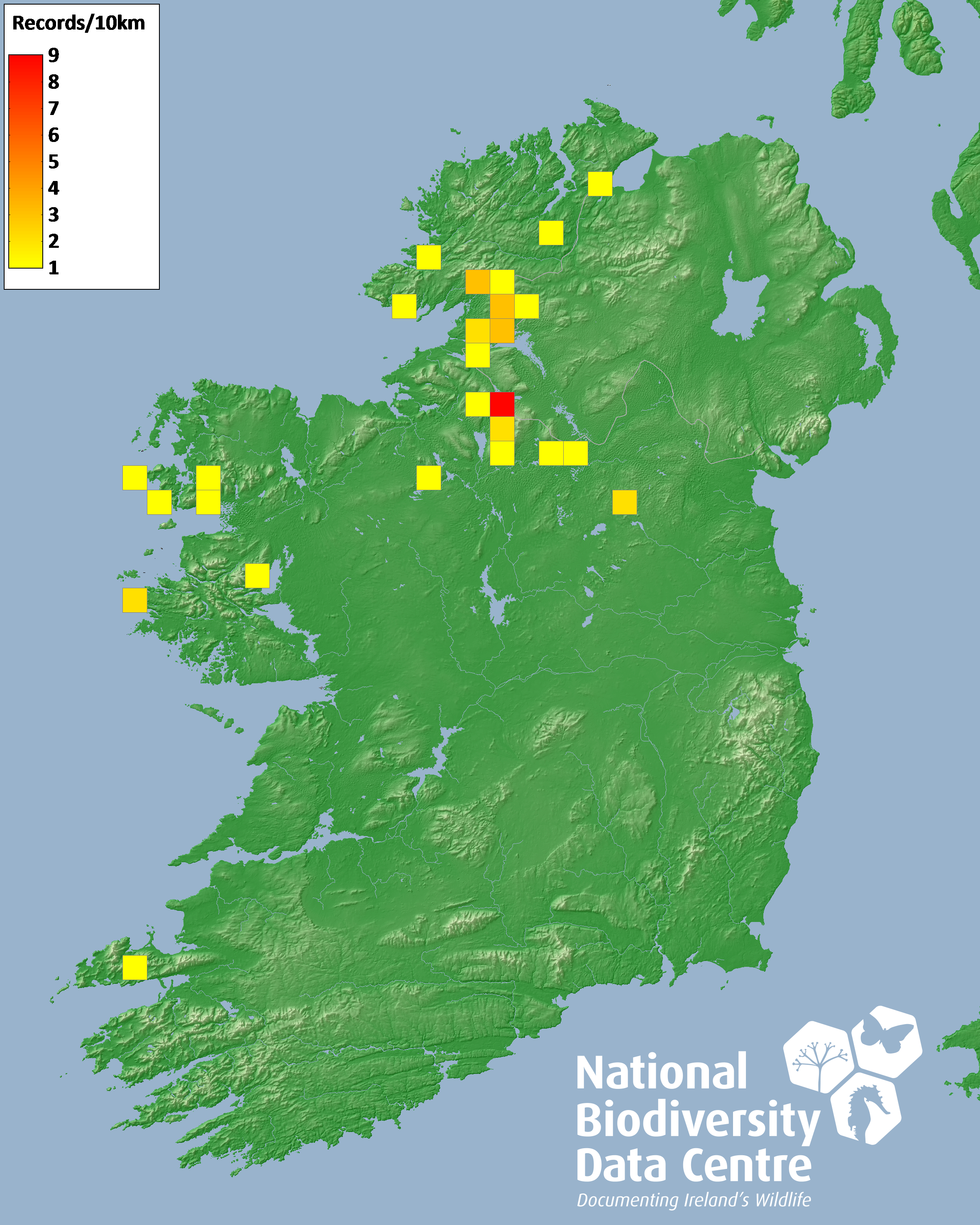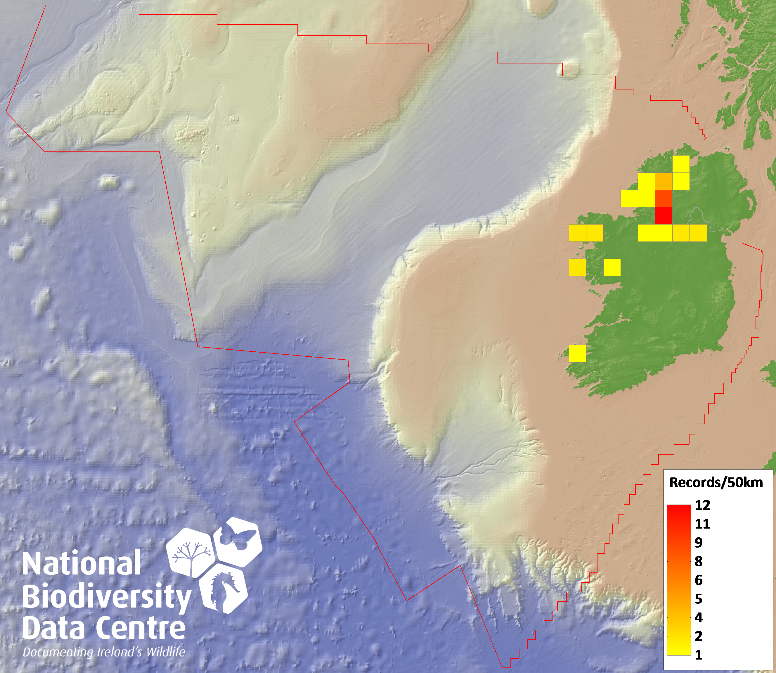 Distribution of the number of records recorded within each 10km grid square (ITM).Marine Map - 50km