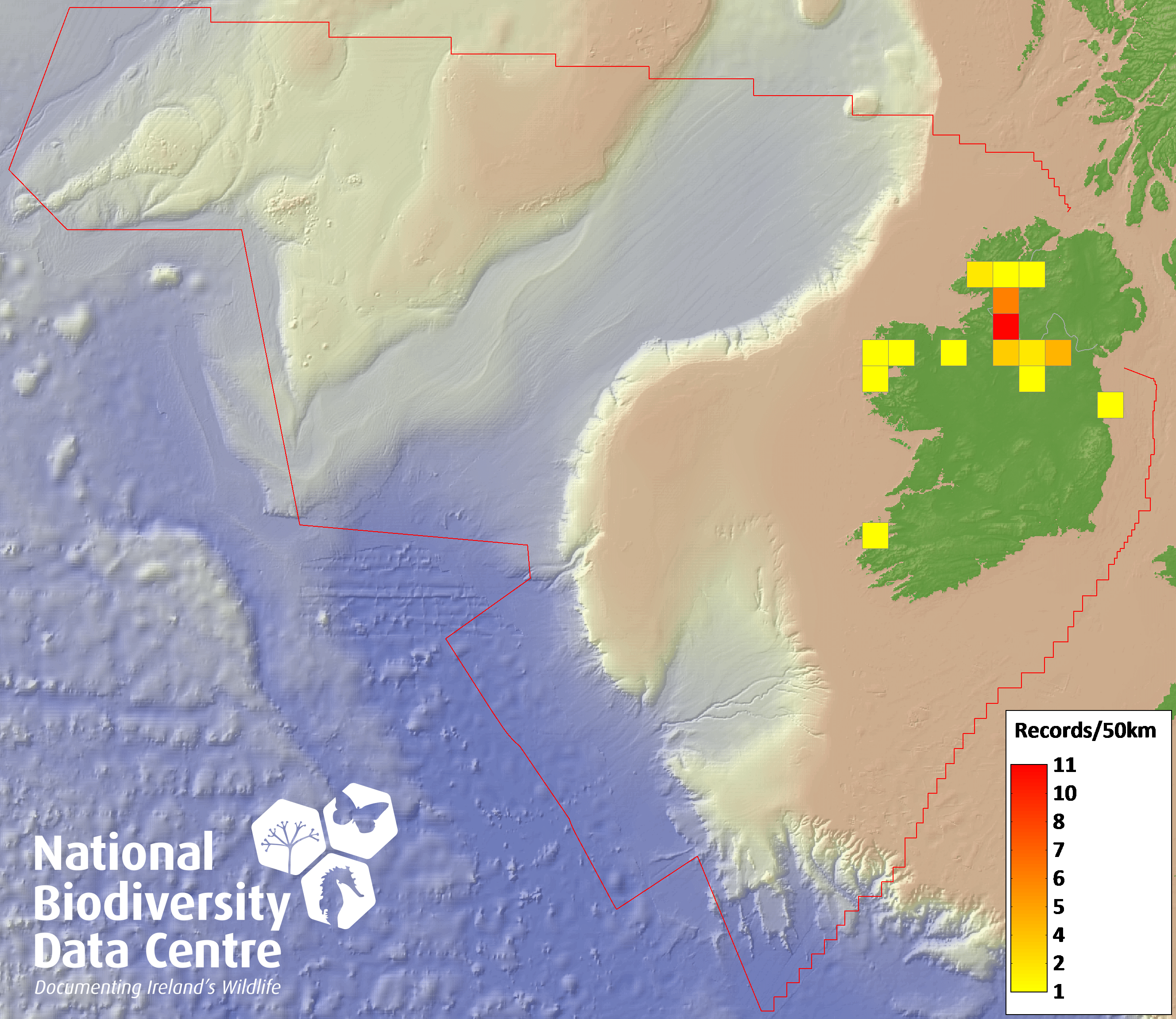 Distribution of the number of records recorded within each 10km grid square (ITM).Marine Map - 50km