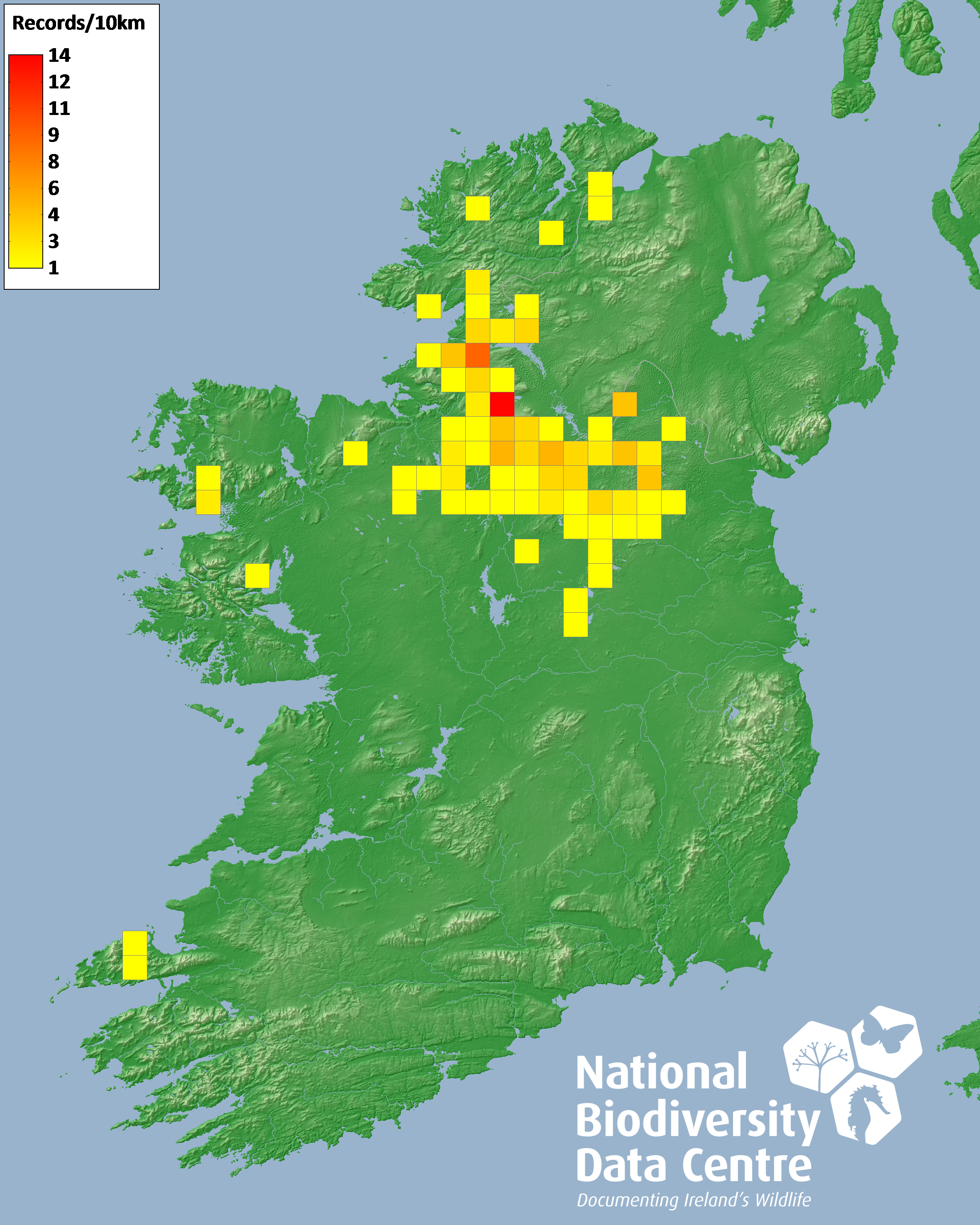 Distribution of the number of records recorded within each 10km grid square (ITM).Marine Map - 50km